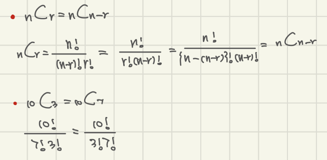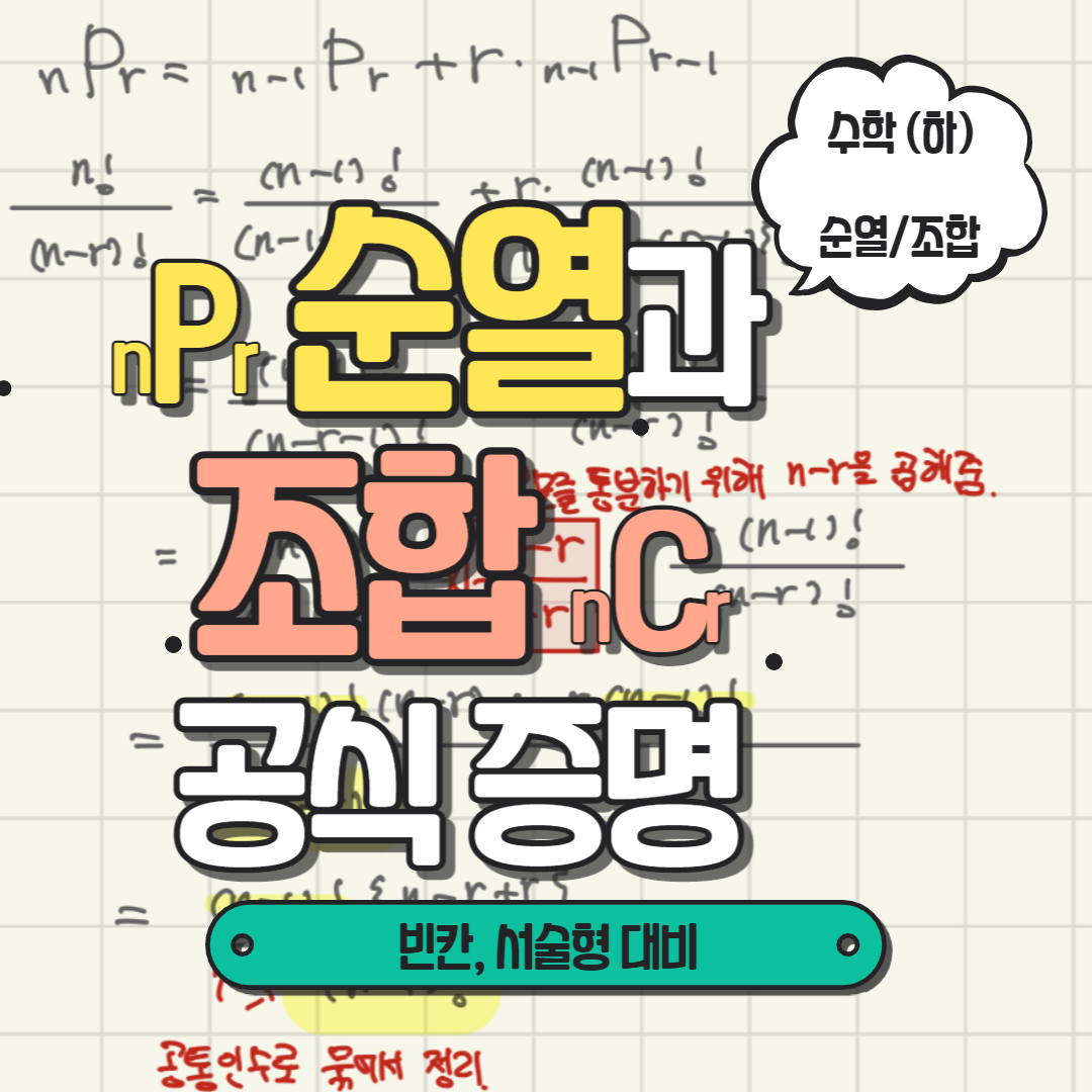 위의 성질들은 조합에서 맨 위의 두 개 식을 제외하면 굳이 외워서 써야 하는 식은 아닙니다. 그래서 증명 정도만 할 수 있으면 됩니다. 아니면 빈칸 형태로 나왔을 때 채워넣는 것 정도는 할 수 있어야겠죠?