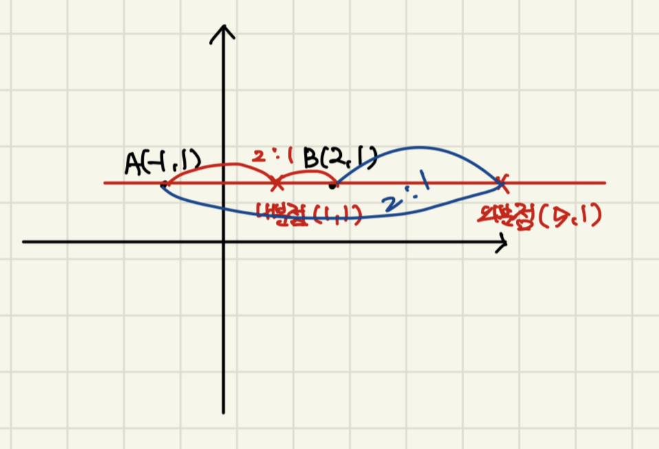 y의 좌표가 같으므로 내분점/외분점을 이용하는 편이 훨씬 간단하다.