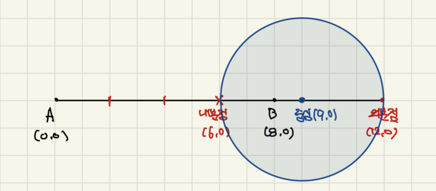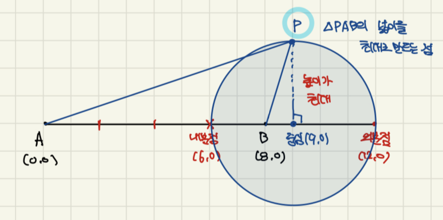 두 점 A,B를 좌표평면으로 갖고 와서 A(0,0), B(8,0)으로 두면, 둘 다 x축 위에 있는 점이므로 선분의 내외분점으로 원을 만드는 편이 더 빠르다.