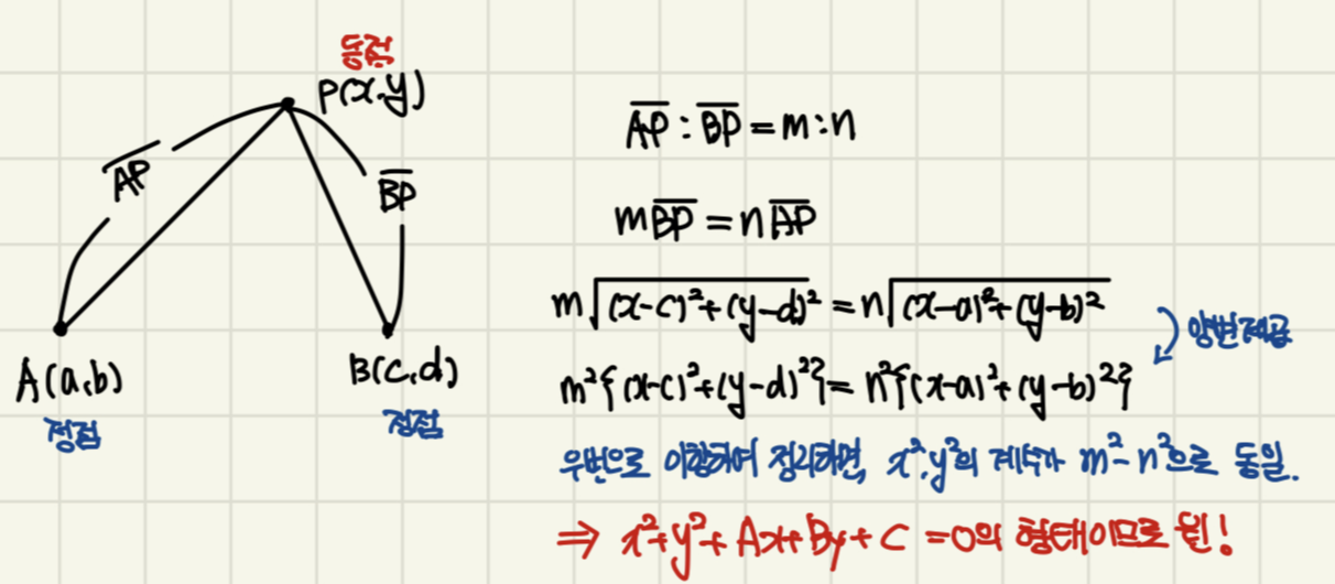 두 정점으로 부터 거리의 비가 m:n이 되는 점 P(x,y)의 자취를 구해봅시다.
