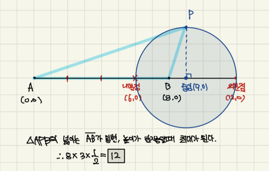 위에서 풀어본 두 유형은 잘 나오는데, 각이 최대냐, 삼각형의 넓이가 최대냐에 따라 점 P를 잡는 기준이 달라집니다.