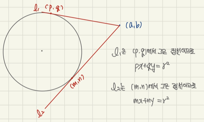 두 직선이 모두 원 밖의 점 (a,b)를 지나죠.