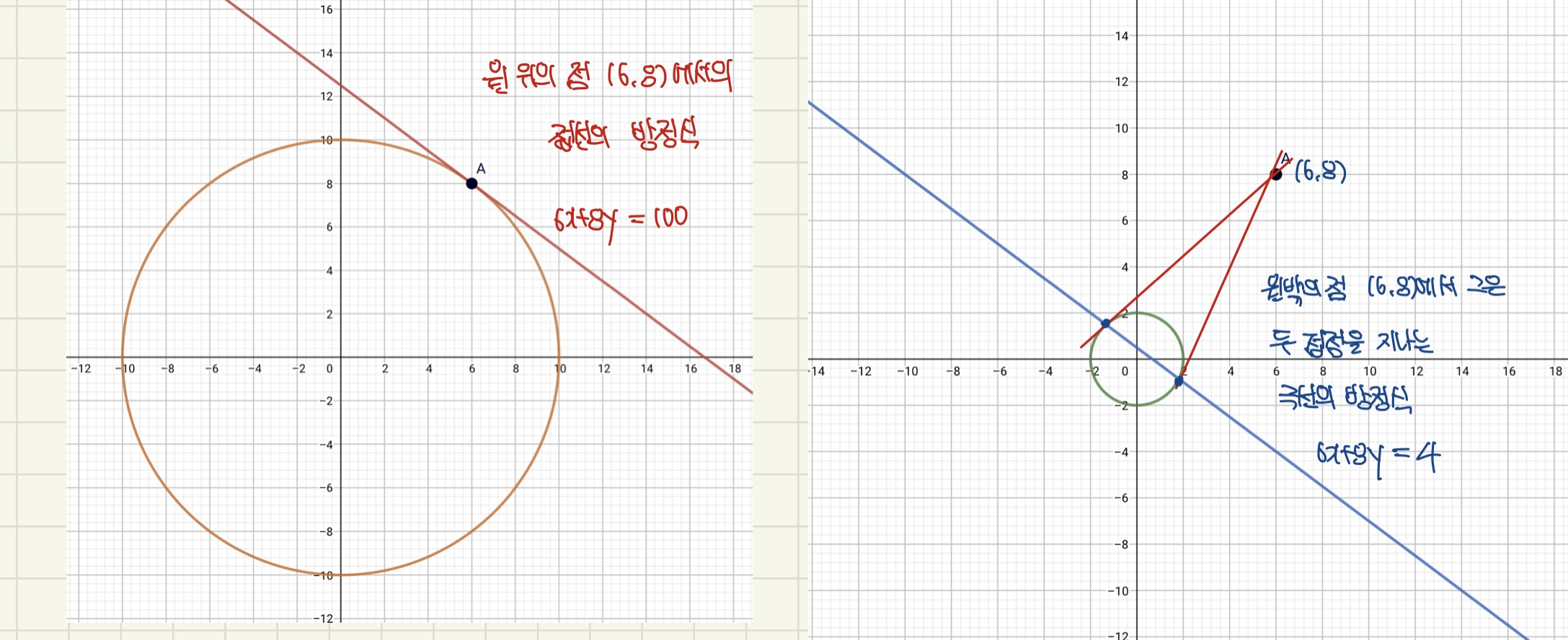 원 위의 점 (6,8)에서의 접선의 방정식