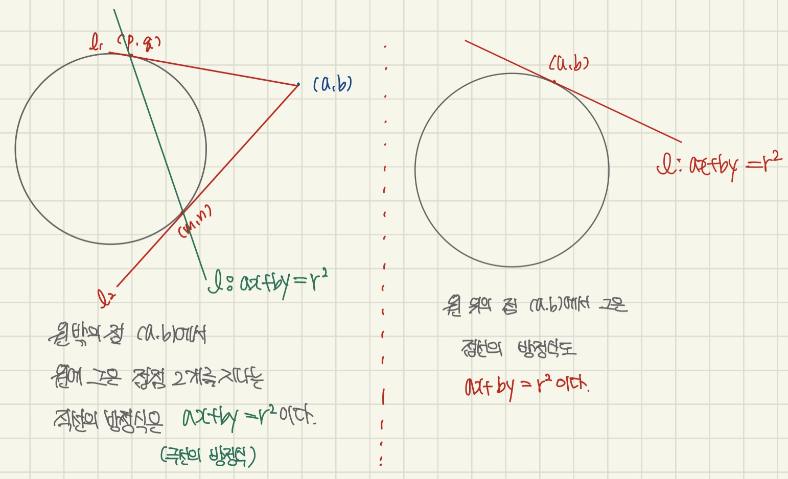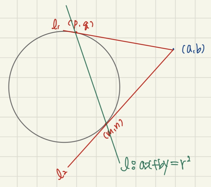 두 직선이 모두 원 밖의 점 (a,b)를 지나죠.