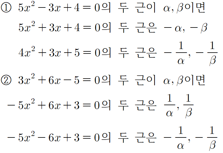 이전에 이차방정식을 배우면서 계수를 통해 근을 빨리 구하는 방법을 배웠던 것 기억 나시나요? 근이 역수거나, 음수인 경우에는 금방 구할 수 있었죠. 만약 기억이 안 나신다면 아래 포스팅을