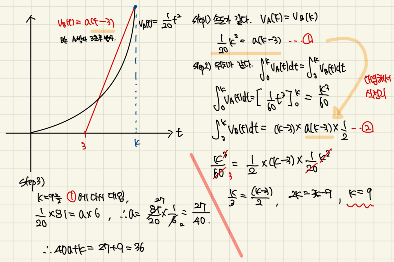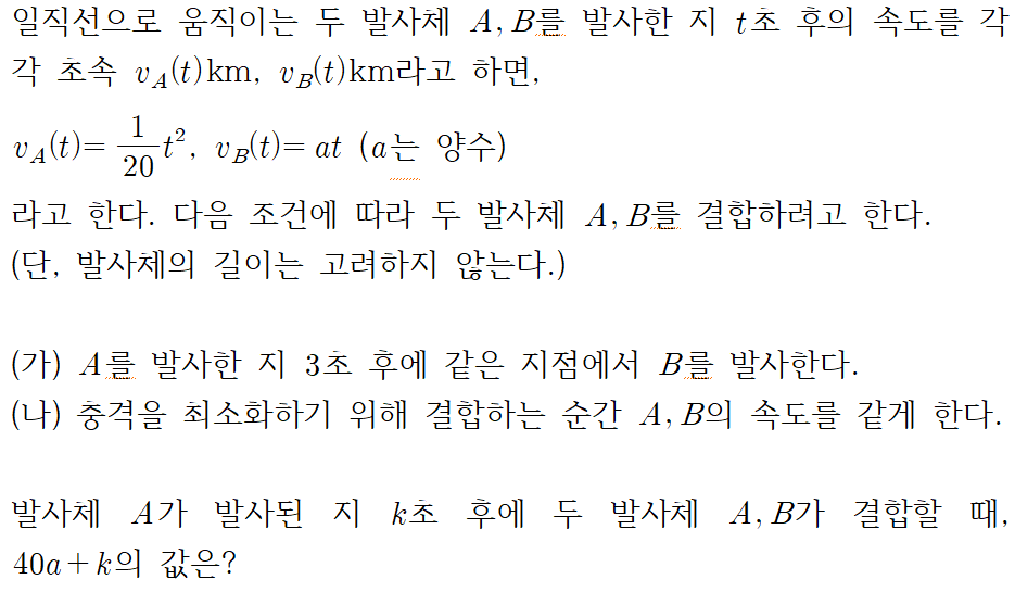 제동을 건 후 완전히 정지할 때까지의 ㅇㅇㅇㅇ를 안전거리로 유지하면 된다. ㅇㅇㅇㅇ를 구하기 위해 t초 후의 속도 v(t)를 구하자. 감속하는 일정 비율을 k라 하면, v(t)=80-kt이다. 5초 후에 정지하므로 80-5k=0이고, k=16이다. (중략) ...