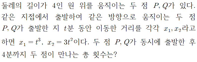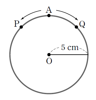 아래 그림과 같이 반지름의 길이가 5cm인 원 위의 한 점 A에서 두 점 P, Q가 동시에 출발하여 서로 반대 방향으로 원 위를 움직이고 있다. 점 A를 출발한 지 t초 후의 두 점 P, Q의 속력이 각각 (4t+2) cm/s, (2t+3) cm/s일 때, 출발 후 10초 동안 두 점이 만나는 횟수를 구하여라. (단, π=3.14로 계산한다.)