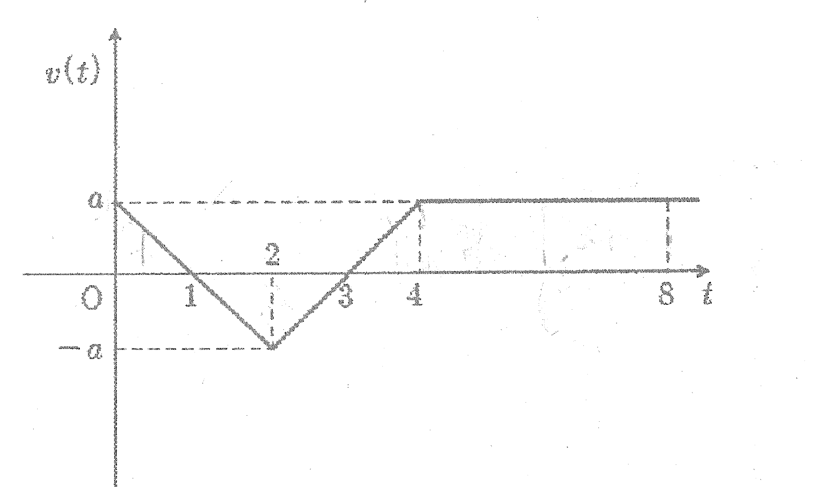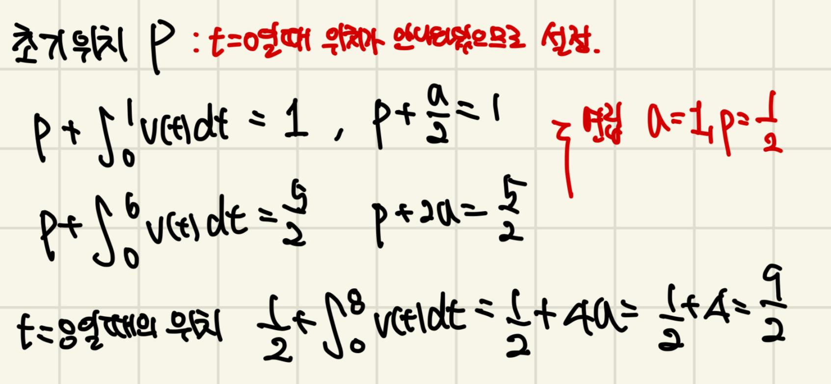 수직선 위를 움직이는 점 P의 시각 t에서의 속도 v(t)의 그래프는 아래 그림과 같다. t=1, t=6일 때의 점 P의 위치가 각각 1, 5/2일 때, t=8일 때의 점 P의 위치를 구하는 풀이과정과 답을 서술하시오. (단, a>0)