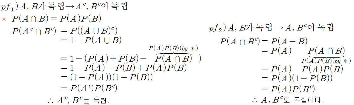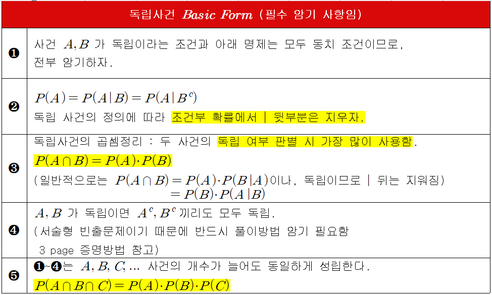 * 사건의 독립과 종속은 직관적으로 알 수 있는 경우도 있으나, 대부분은 독립/종속 판단 여부를 수식으로 증명해야 하므로, 반드시 독립사건의 성질을 암기하고 사용해야 합니다.