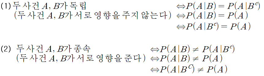 두 사건 A,B가 독립이 아닐 때, 사건 A,B는 서로 종속이라 하고, 종속인 두 사건을 종속사건이라 부릅니다.