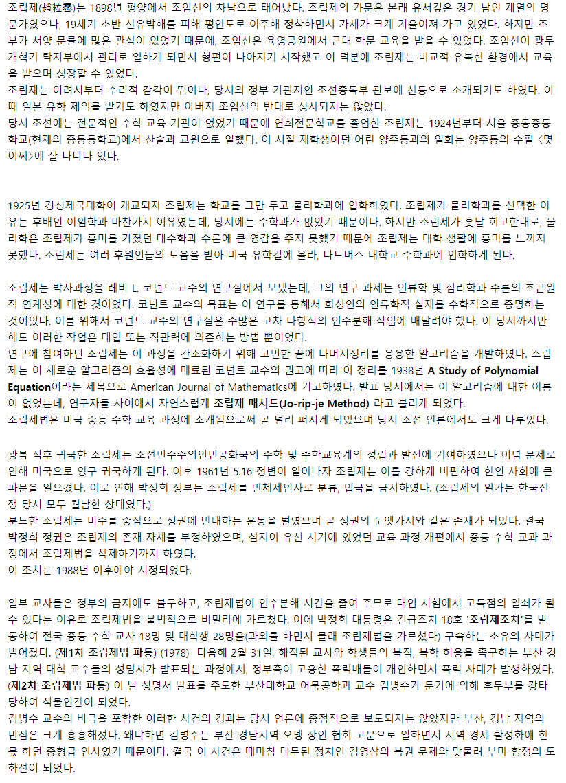 우리나라의 유명한 수학자 조립제-라고 어디서 태어났고, 어떤 연구를 했는지 그럴싸하게 올라온 글 아마 쉽게 찾으실 거에요. 각종 커뮤니티나 페이스북 페이지 등에서 꽤나 핫한 게시물이 되었던 걸로 기억합니다.