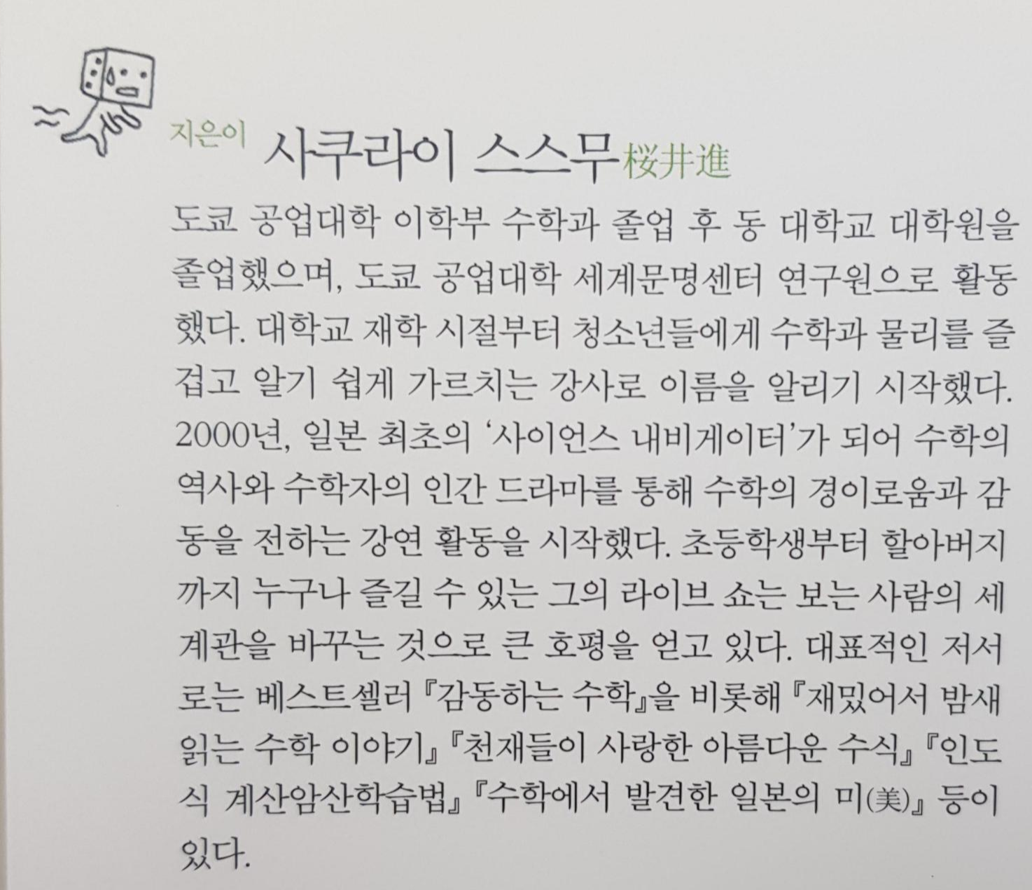 오늘 추천해드릴 수학 책은 '초 재밌어서 밤새읽는 수학 이야기'입니다. 이전에 추천 도서로 썼던 재밌어서 밤새 읽는 수학자들 이야기의 저자 사쿠라이 스스무의 다른 책이에요. 전작보다 조금더 라이트한 내용을 다루었고, 수학자가 아닌 실생활에서 쓰이는 여러가지 수학에 대해 다루고 있습니다.