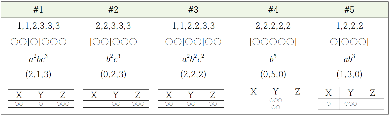 1,1,1,2,2,3 ⇔ ○○○│○○│○