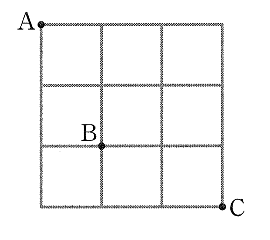 그림과 같은 정사각형 모양의 길이 있다. A 지점에서 출발하여 B 지점을 거쳐 C 지점까지 갈 때, 가장 짧은 거리로 가는 경우의 수를 구하시오.