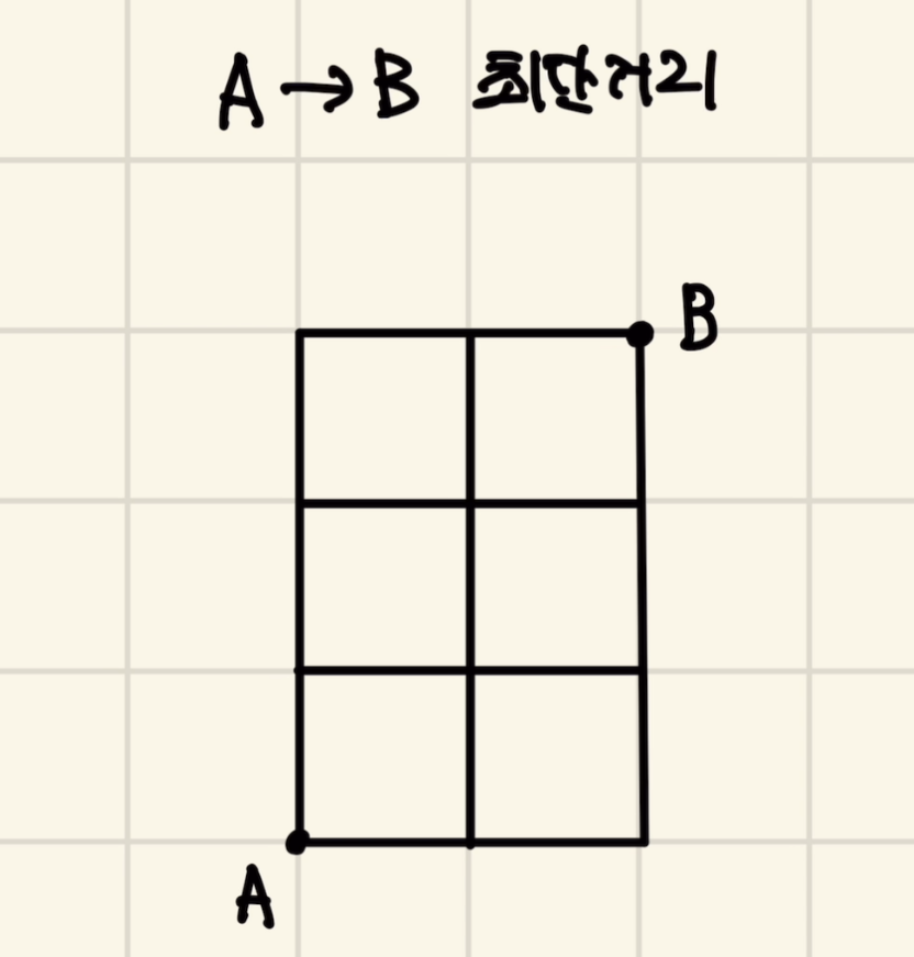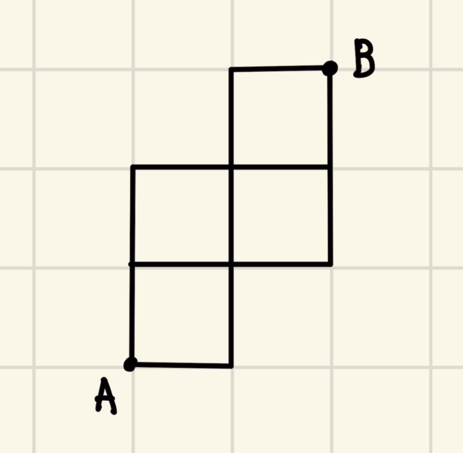 그림과 같이 점 A에서 출발하여 오른쪽 혹은 위쪽으로 1칸씩 이동하면서 점 B에 도착한다.
