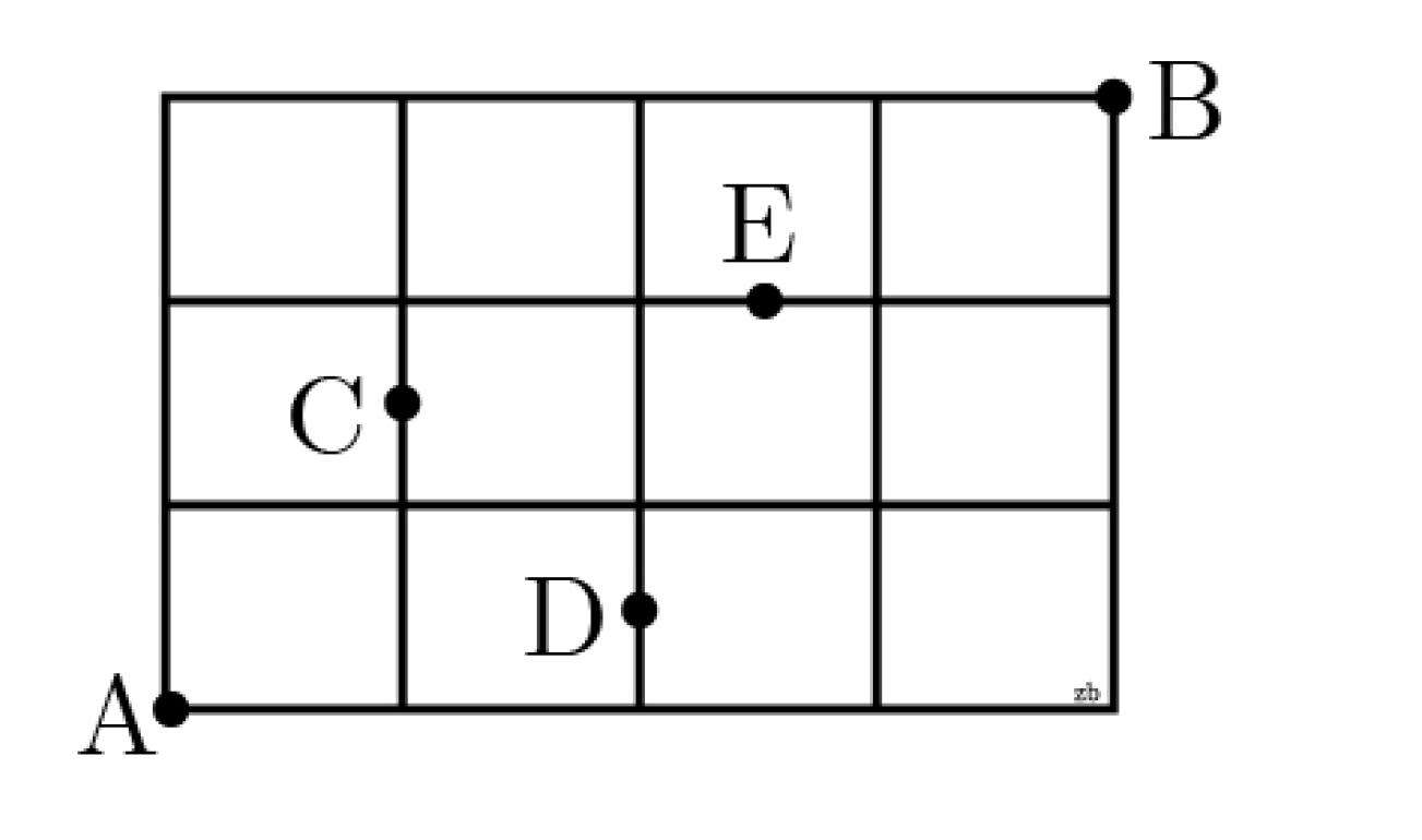 점 C,D,E 중 정확히 하나만 지나면서 점 A에서 점 B로 이동하는 경우의 수는?