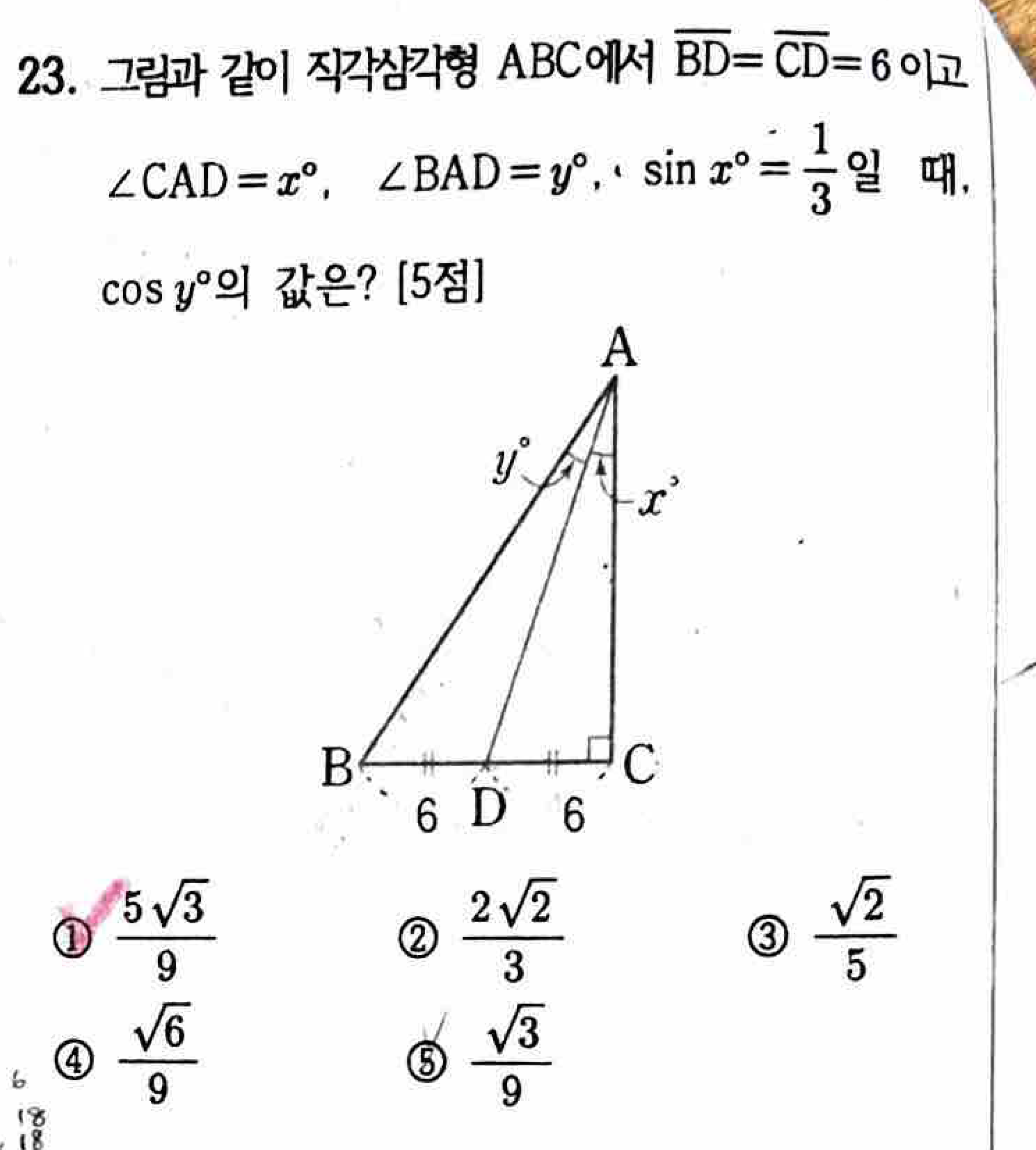 그림과 같이 BD=CD인 직각삼각형 ABC에서