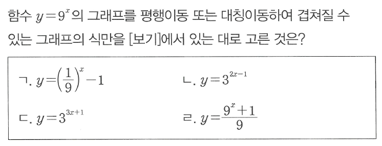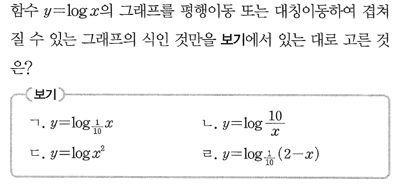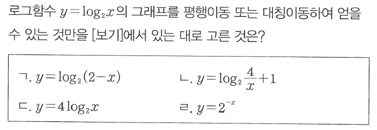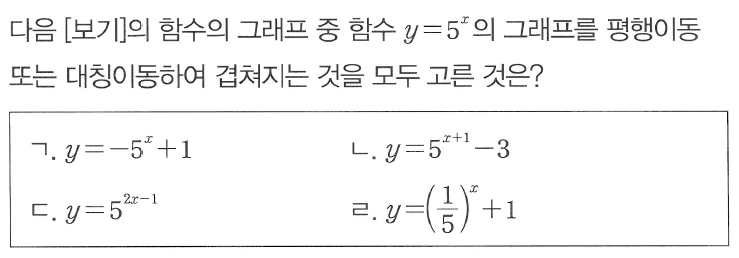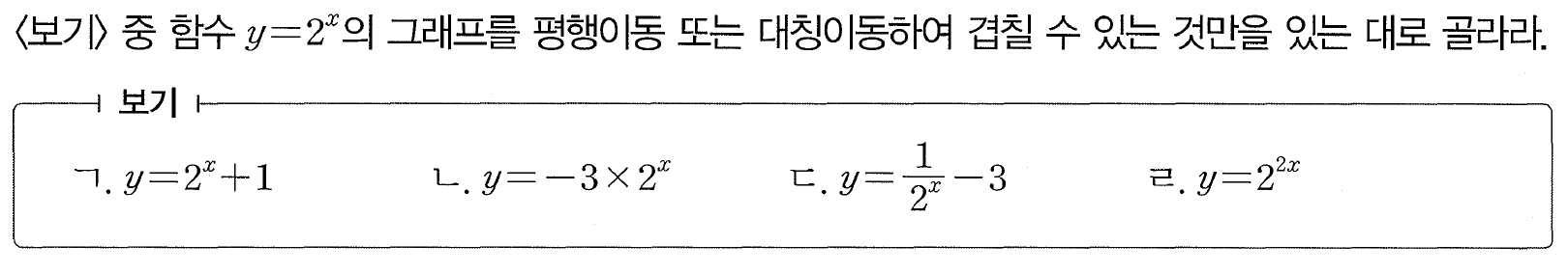 기본적인 평행이동/대칭이동은 다들 아실테니 설명을 생략하고 넘어가겠습니다. 오늘은 종종 내신에서 다루는 지수함수 또는 로그함수를 평행이동, 대칭이동해서 만들 수 없는 모양을 물어보는 문제를 풀어볼거에요.
