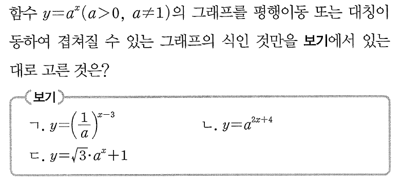 정답 : ㄹ (문제에서 같은 함수를 물어봤으므로 ㄹ만 답임. 평행이동/혹은 대칭이동해서 같은 함수가 되는 거면 ㄴ,ㄷ도 됨)