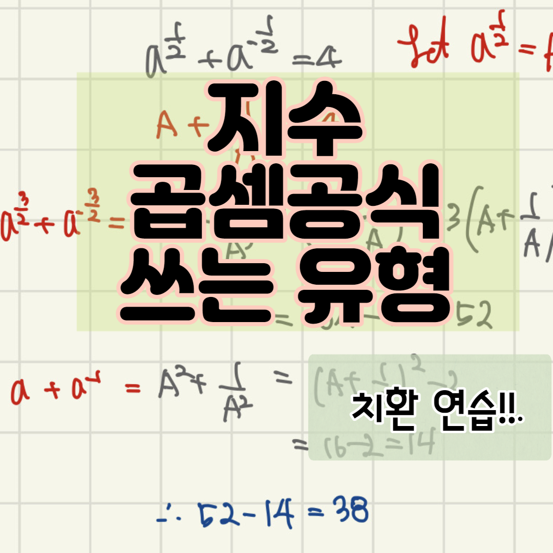 지수에 분수가 들어가 있으면 치환해서 푸는 게 훨씬 편합니다. 그래서 오늘은 지수 단원에서 배우는 내용 중, 곱셈 공식 쓰는 유형을 모두 치환으로 풀어볼 거예요.