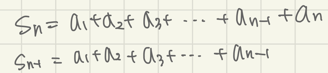1항부터 차례대로 더해주면 됩니다. 그렇다면 n항까지의 합이나 (n-1)항까지의 합도 아래와 같이 쓸 수 있습니다.