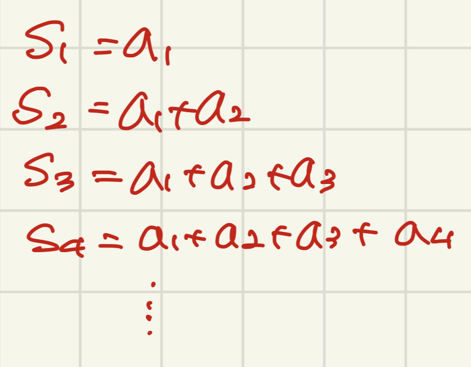 Sn은 수열의 첫번째 항부터 n번째 항까지의 합입니다. 즉 누적해서 쭉 더하는 거죠.