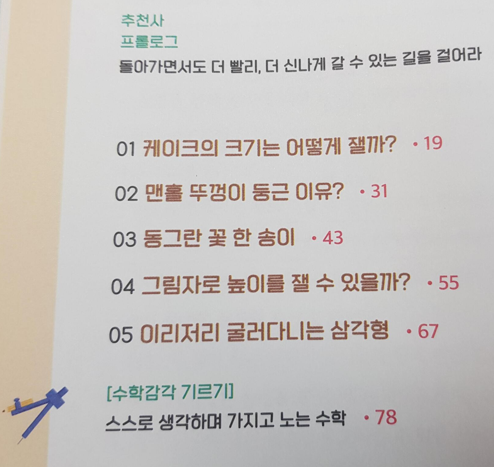 책의 초반부에 있는 내용입니다. 공부를 잘하는 하나의 포인트는 '재미'라고 언급되어 있어요. 그래서 이 책에도 생활 주변에서 실제로 접할 수 있는 수학적 지식들이 쓰여있습니다. 자세한 내용은 아래 서술해놓았어요!