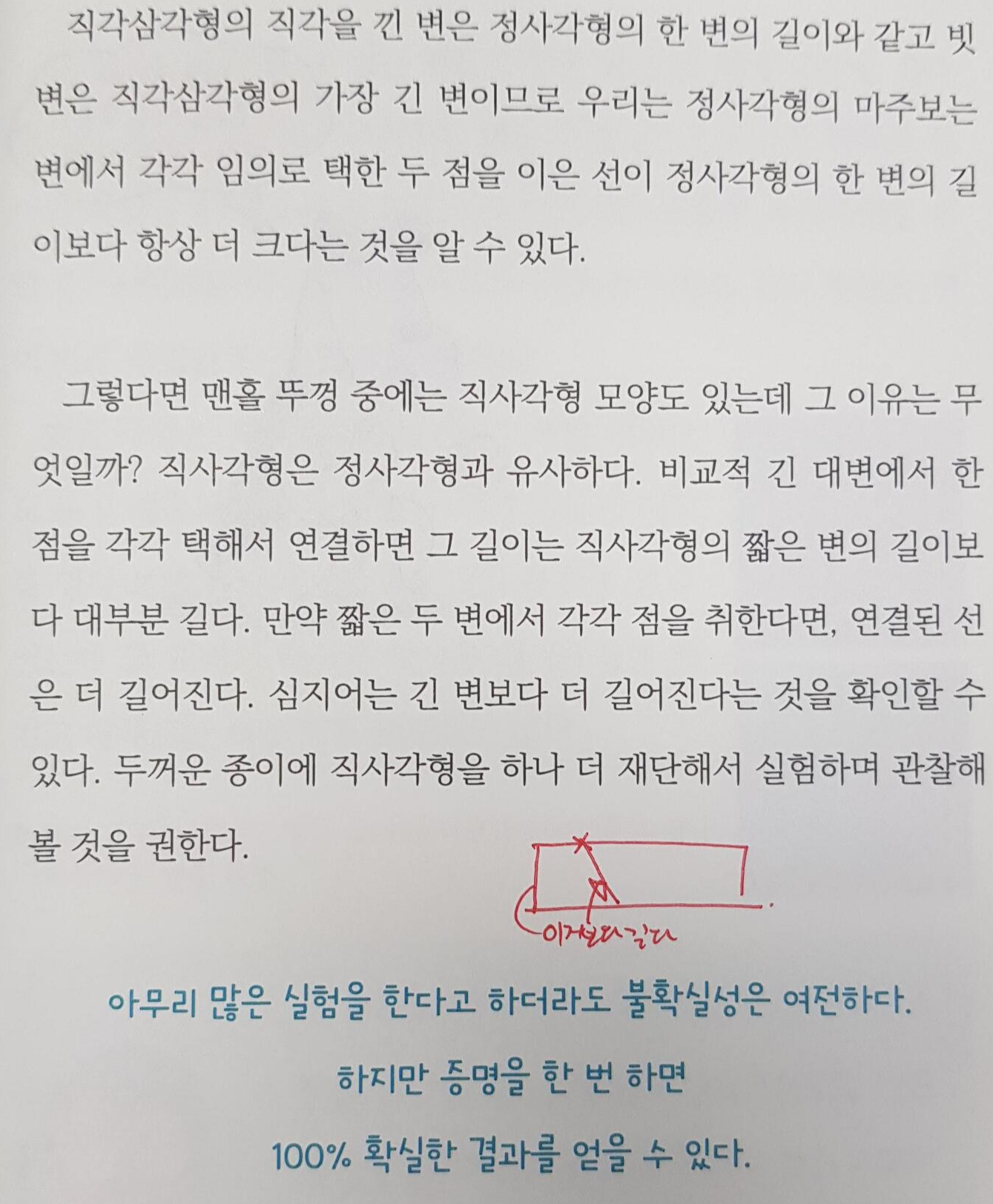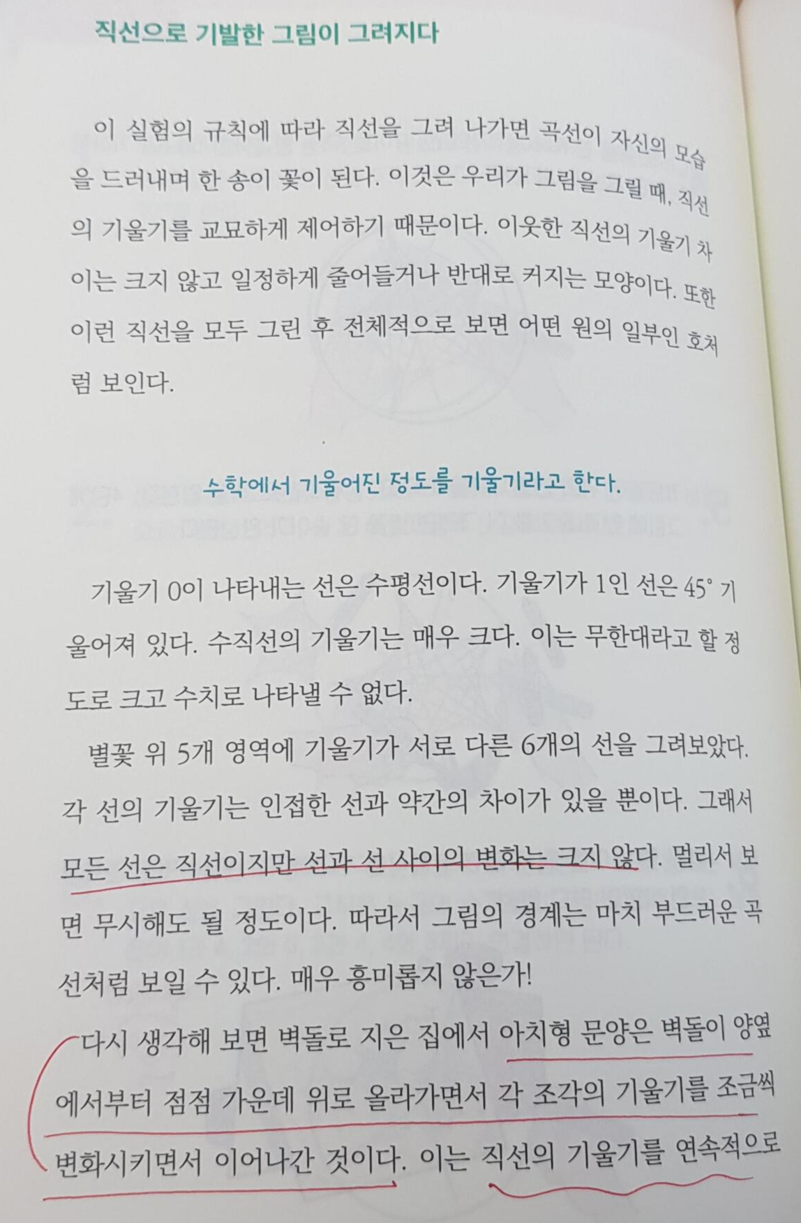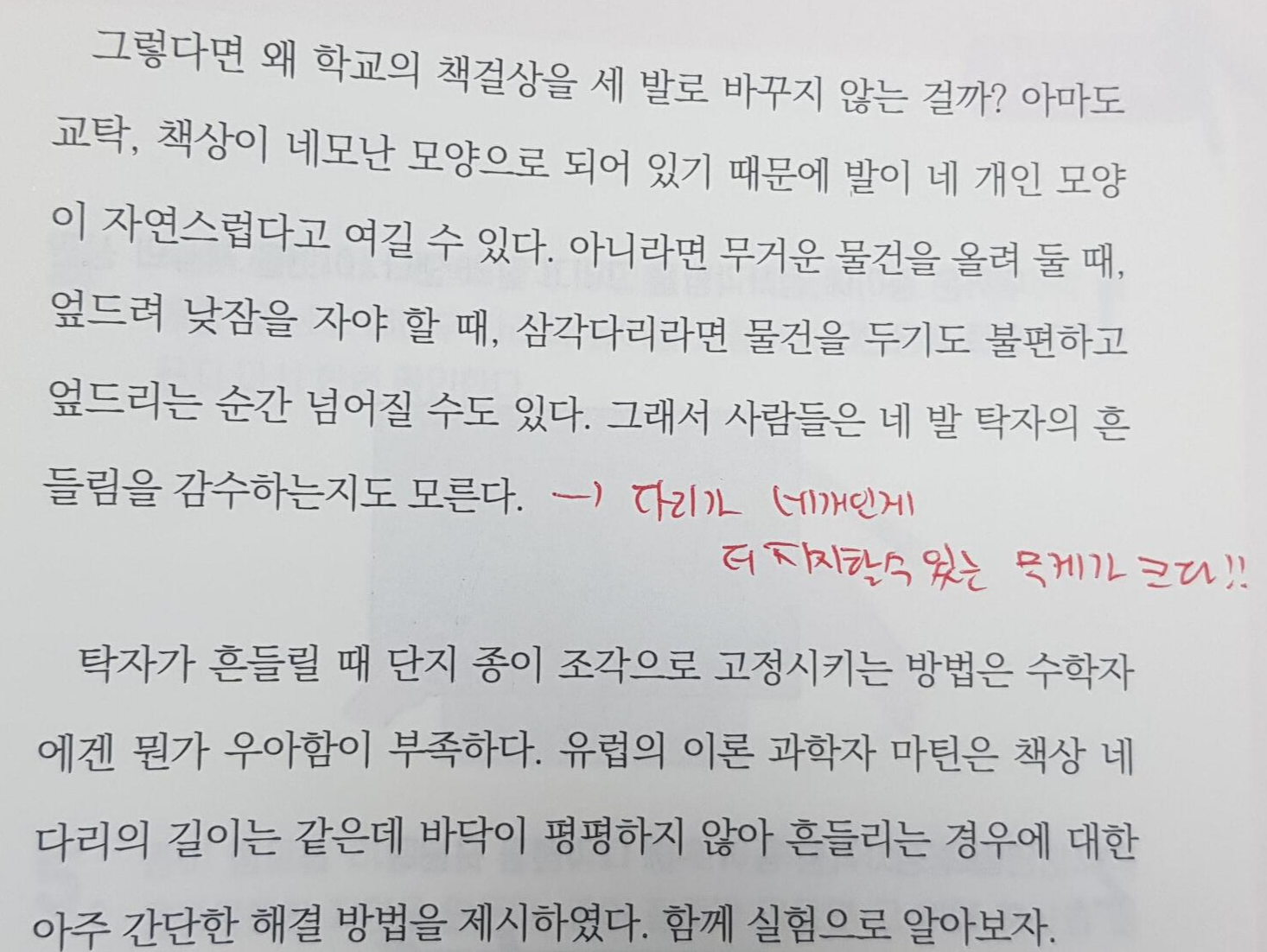 이 책이 고등학생 타겟은 아니라는 걸, 전 읽으면서 느꼈답니다. 아래는 세 점으로 한 평면을 만들 수 있기 때문에, 삼각대는 항상 서 있을 수 있단 이야기와 네 다리를 가진 탁자가 흔들릴 때는 탁자를 돌리면 어느 순간 평행이 맞는다는 소재가 연속으로 나오는 부분이에요.