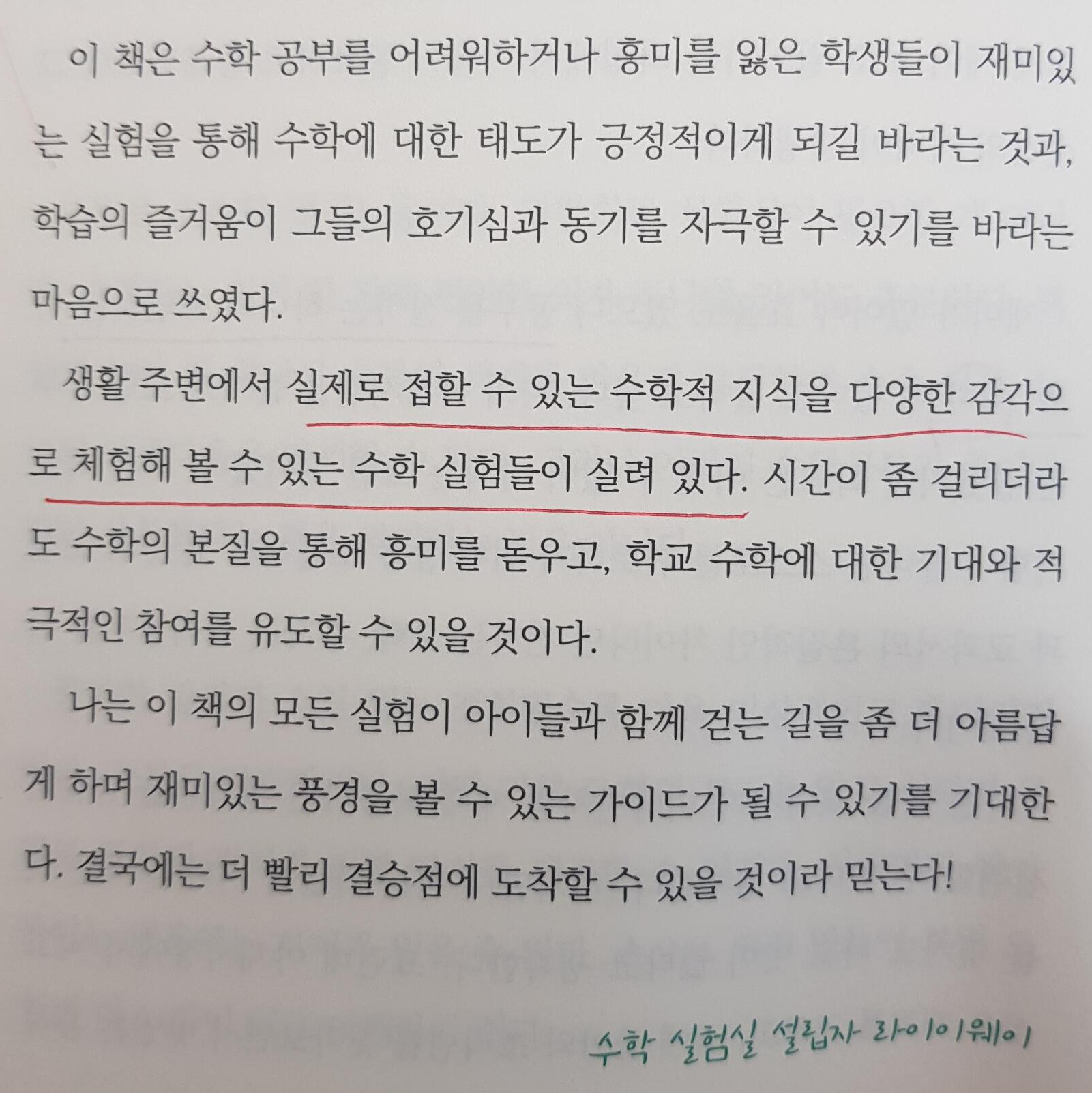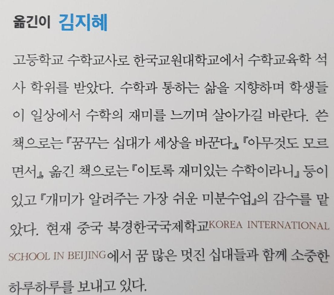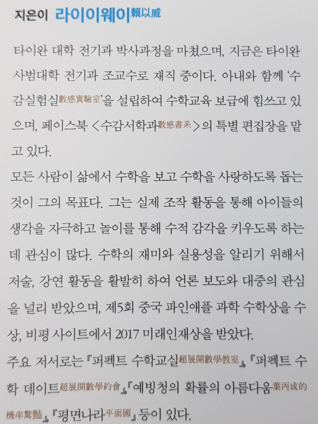 지은이는 타이완 사범대학 전기과 조교수인 라이이웨이입니다. 아내와 같이 '수감실험실'을 설립하여 수학교육쪽에 힘을 쏟고 있는 분이네요. 저서도 대부분 수학과 관련된 책자입니다. 옮긴이는 현직 고등학교 수학교사네요.