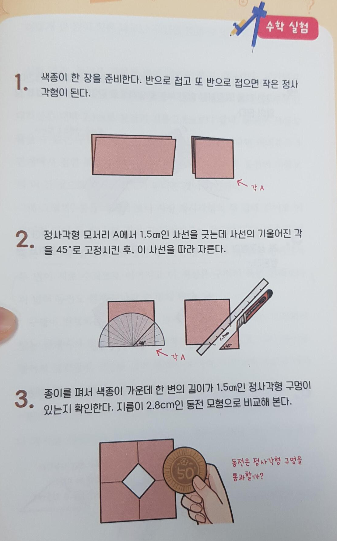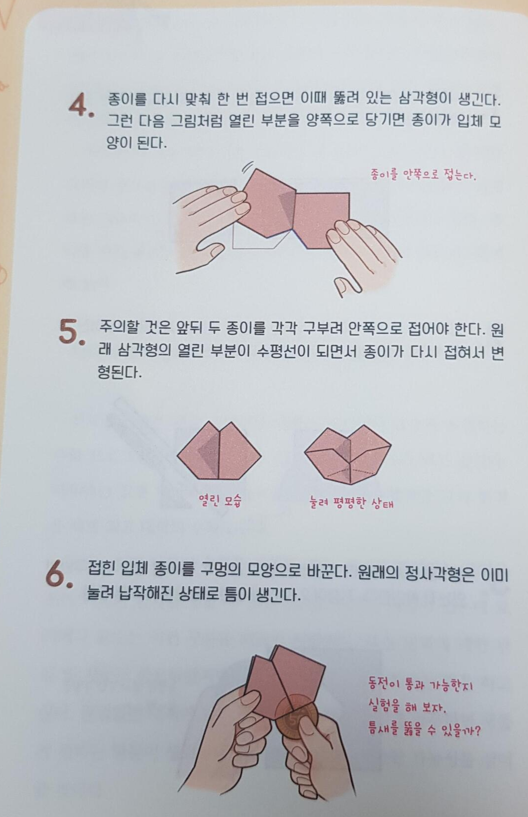 중간중간에는 실제로 해볼 수 있는 수학 실험도 있습니다. 아래는 위의 멘홀에 이어지는 내용인데, 평면을 입체화 하여 더 큰 지름인 동전을 통과시키는 게임이었어요. 이런 건 이론으로 알아도, 실제로 해보면 확실히 아이들 머릿속에 남을 것 같긴 합니다.
