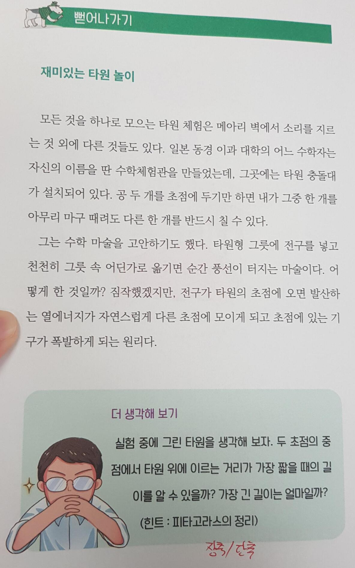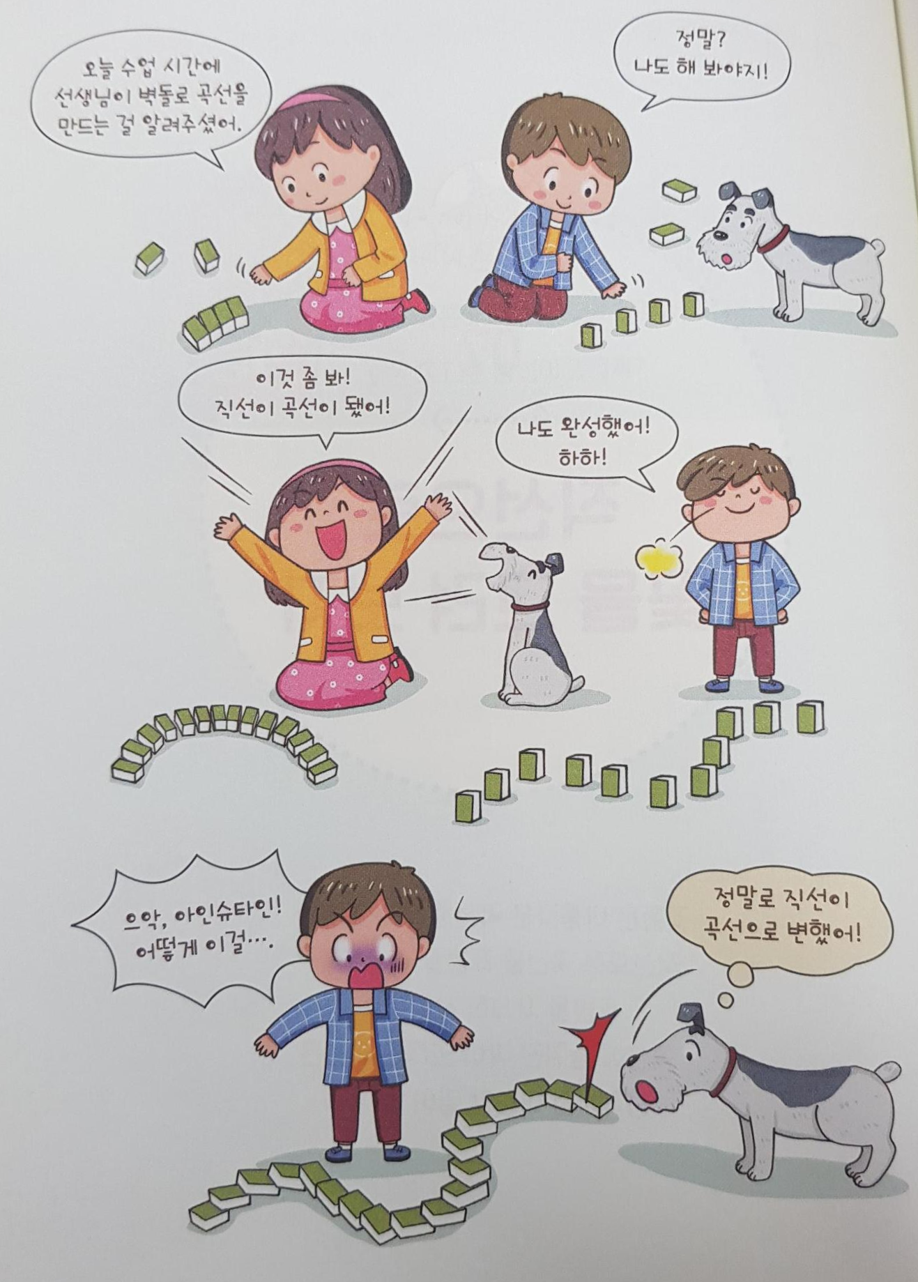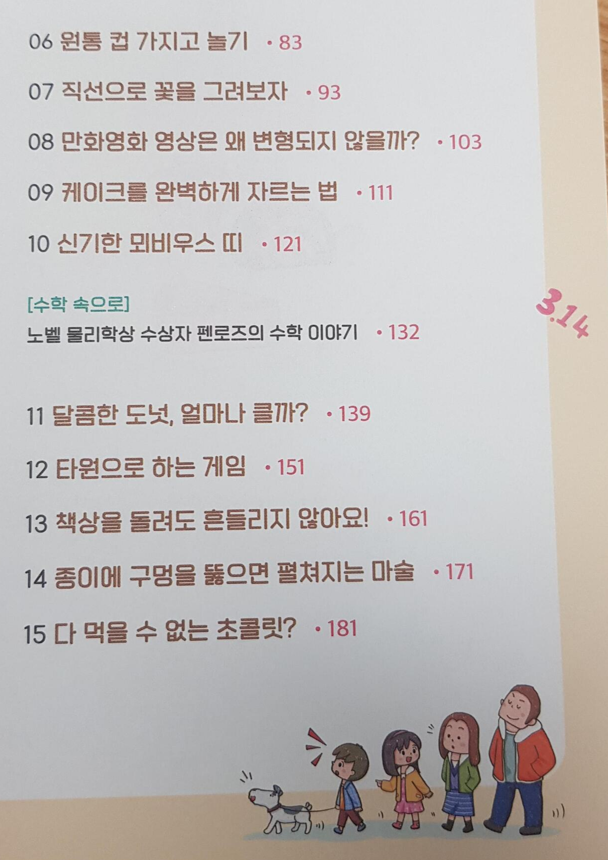 만약 고등학생이 타겟이었다면, 전자의 다리가 네 개인 이유에 더 지지할 수 있는 무게가 크다는 내용을, 뒤의 탁자를 돌릴 때 흔들리지 않는 방법은 사잇값 정리를 이용해서 설명했을 거에요.ㅎㅎ 그렇지만 좀 더 학년이 어린 친구들이 읽어도 이해할 수 있게 재미에만 집중한 듯 해요.