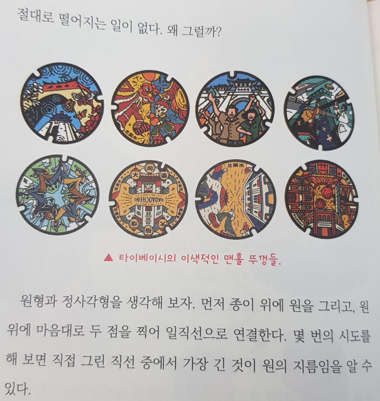 맨홀 뚜껑은 왜 원형일까? 간단한 설명과 함께 타이베이시의 멘홀 뚜껑이 실려있어서 즐겁게 봤습니다. 디자인적인 요소가 들어간 건 처음알았네요. 책이 컬러라 그런지 좀 더 생생하게 와닿기도 합니다.