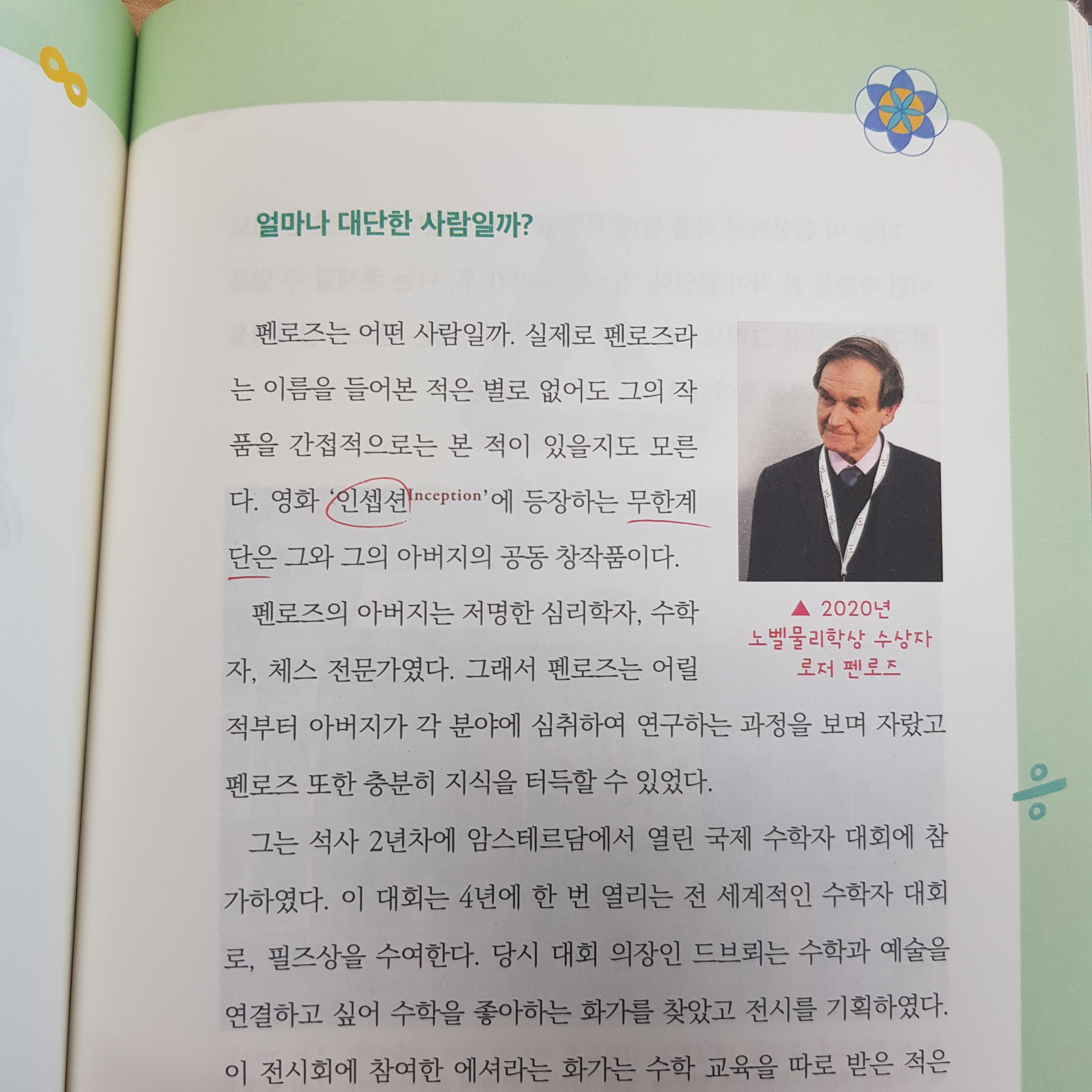 그리고 중간중간에 인물에 대해 다루기도 해요. 저는 펜로즈의 삼각형만 들어봤었는데, 인셉션에 등장하는 무한계단이 이분의 창작품이더라구요.ㅎㅎ 심지어 아직 살아계십니다. 옥스포드 대학교 수학연구소 명예교수님이네요.
