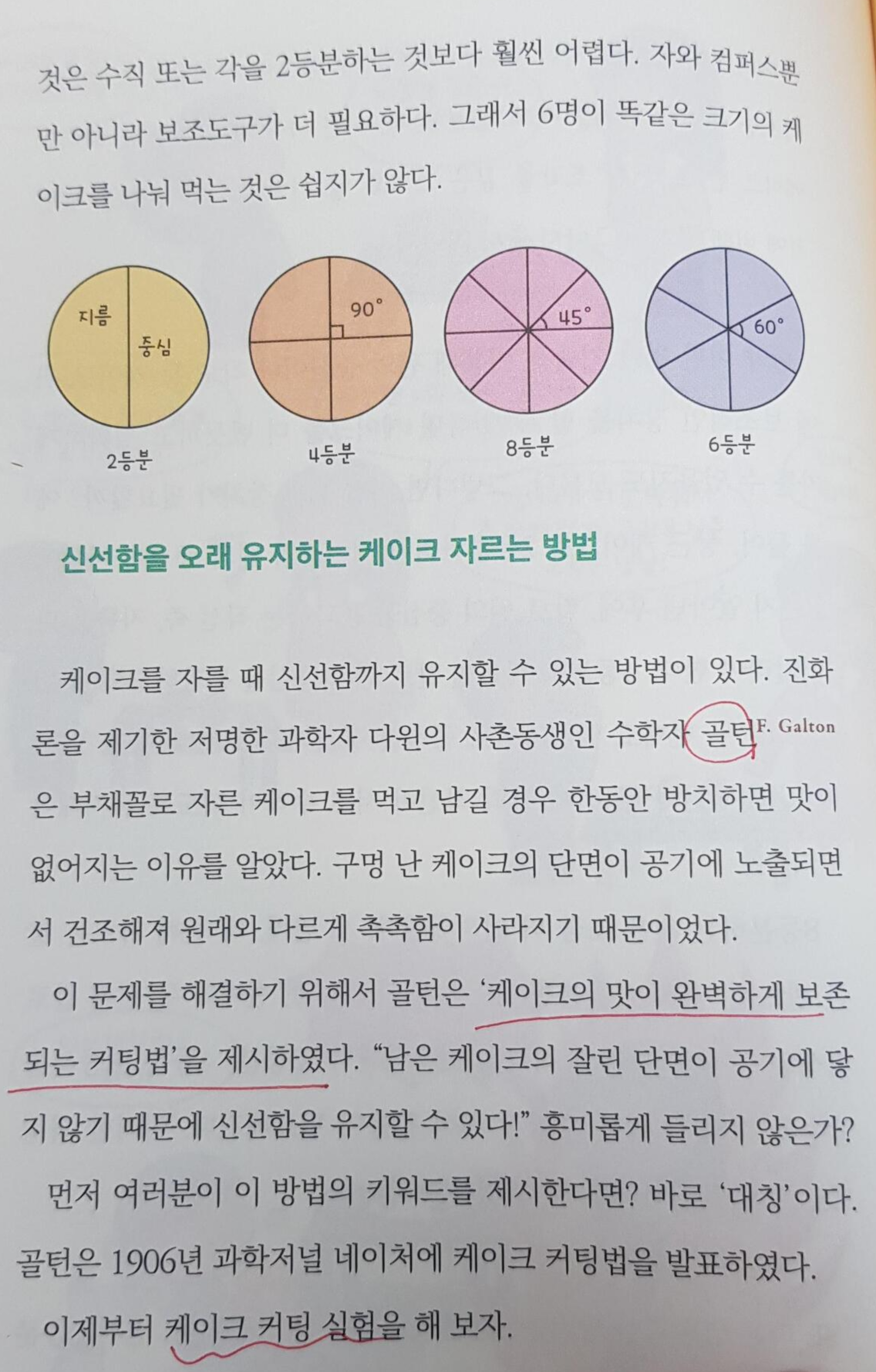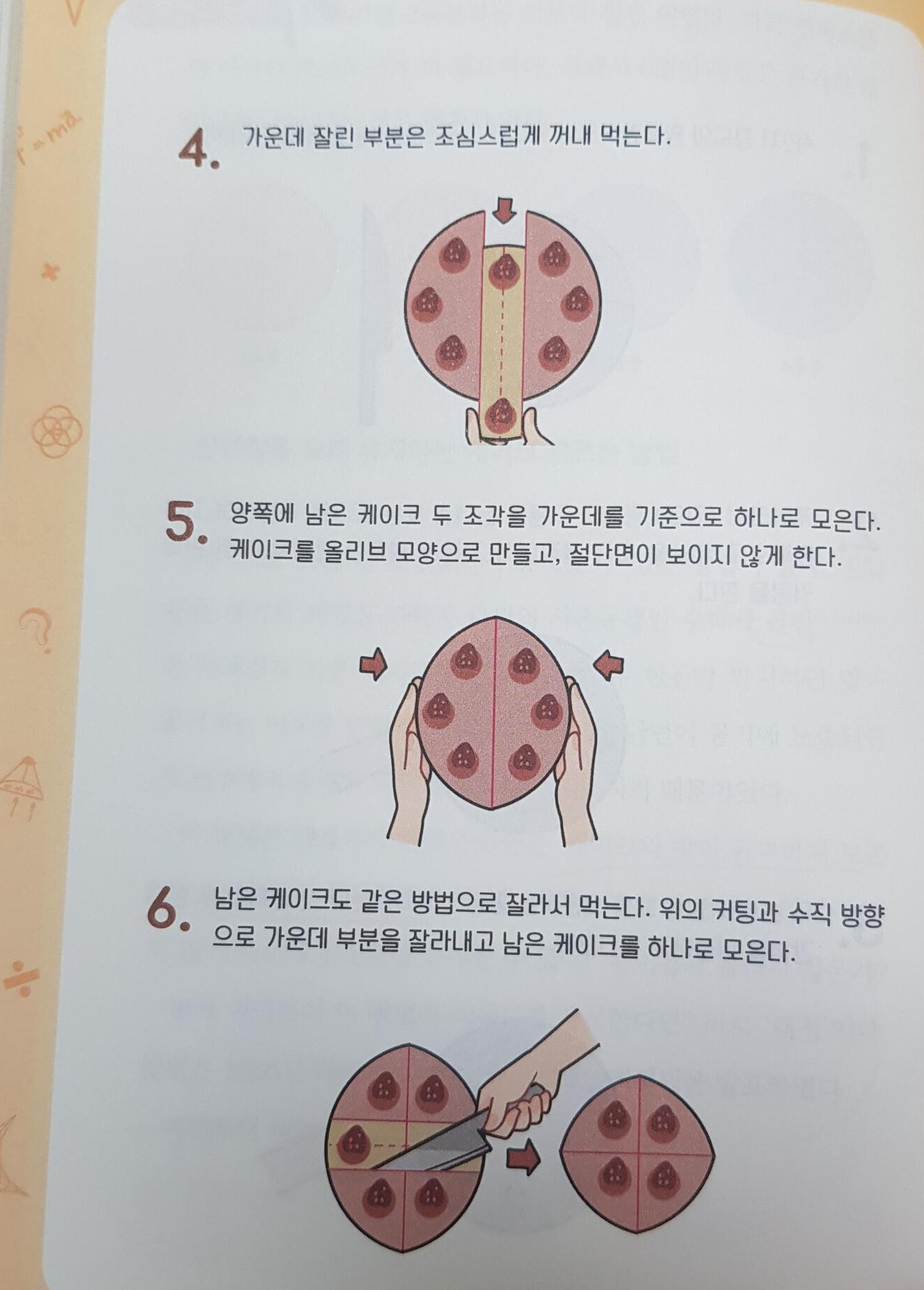 케이크 컷팅법은 진짜 빵 터지면서 읽은 부분이에요. 여섯명이서 케이크를 나눠먹는 방법인데, 6등분은 60도를 나눠야해서 쉽지 않으니 새로운 방법을 알려준다며 남은 두 명은 꼬다리 부위를 잘라서 주죠.ㅋㅋ