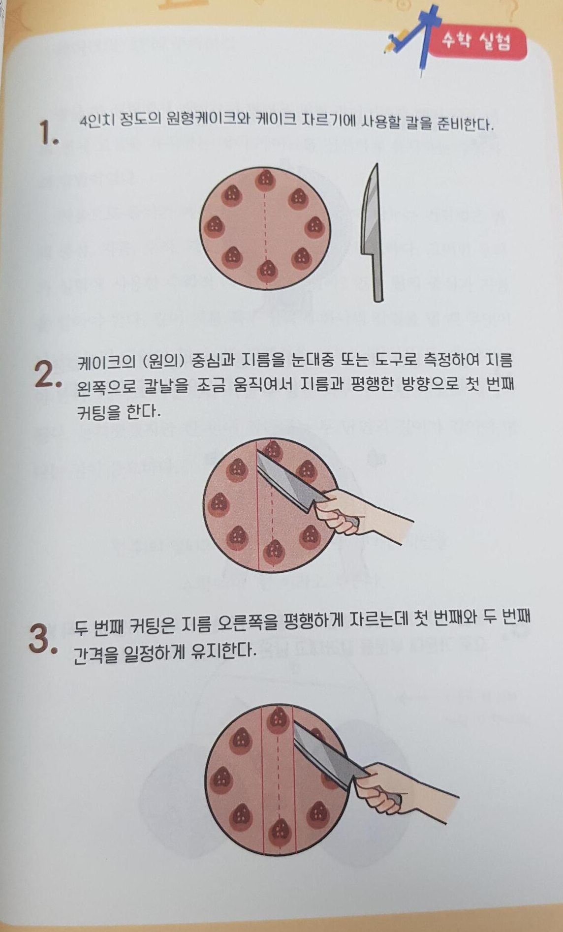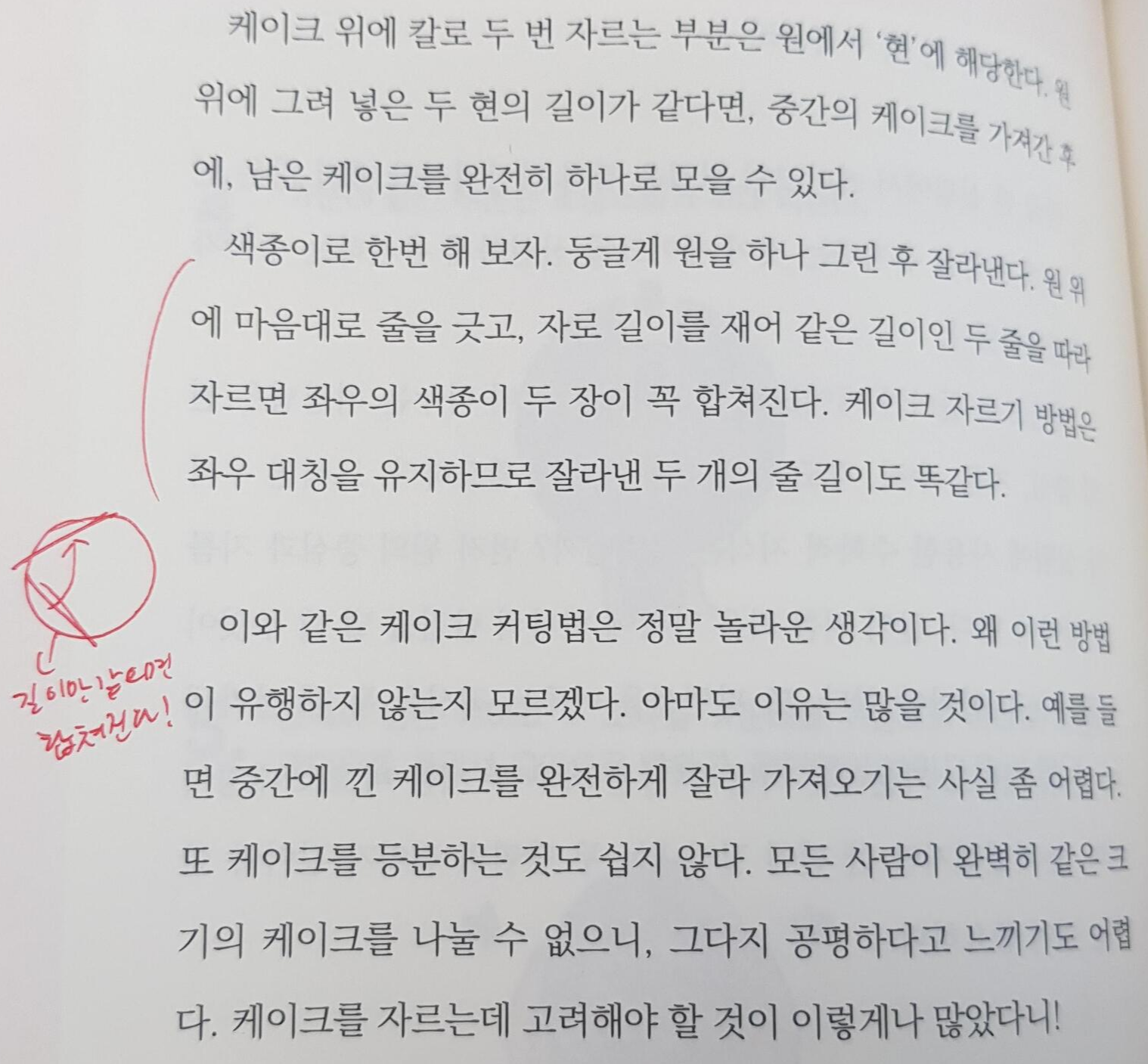 케이크 컷팅법은 진짜 빵 터지면서 읽은 부분이에요. 여섯명이서 케이크를 나눠먹는 방법인데, 6등분은 60도를 나눠야해서 쉽지 않으니 새로운 방법을 알려준다며 남은 두 명은 꼬다리 부위를 잘라서 주죠.ㅋㅋ