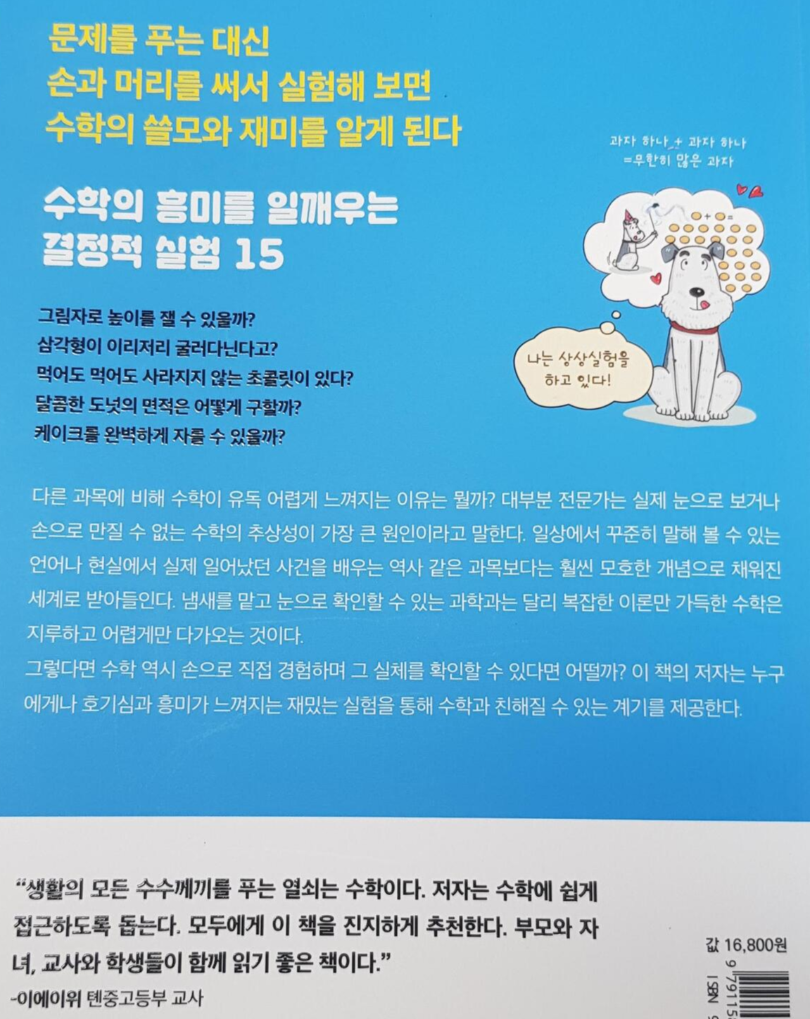 오늘은 간만에 낮은 학년의 친구들도 재미있게 읽을 수 있는 쉬운 책을 갖고 왔습니다. :-) 바로 수학적인 내용들을 일상 생활속의 여러 실험들로 살펴 본 책이에요. '수학, 풀지 말고 실험해 봐'입니다.