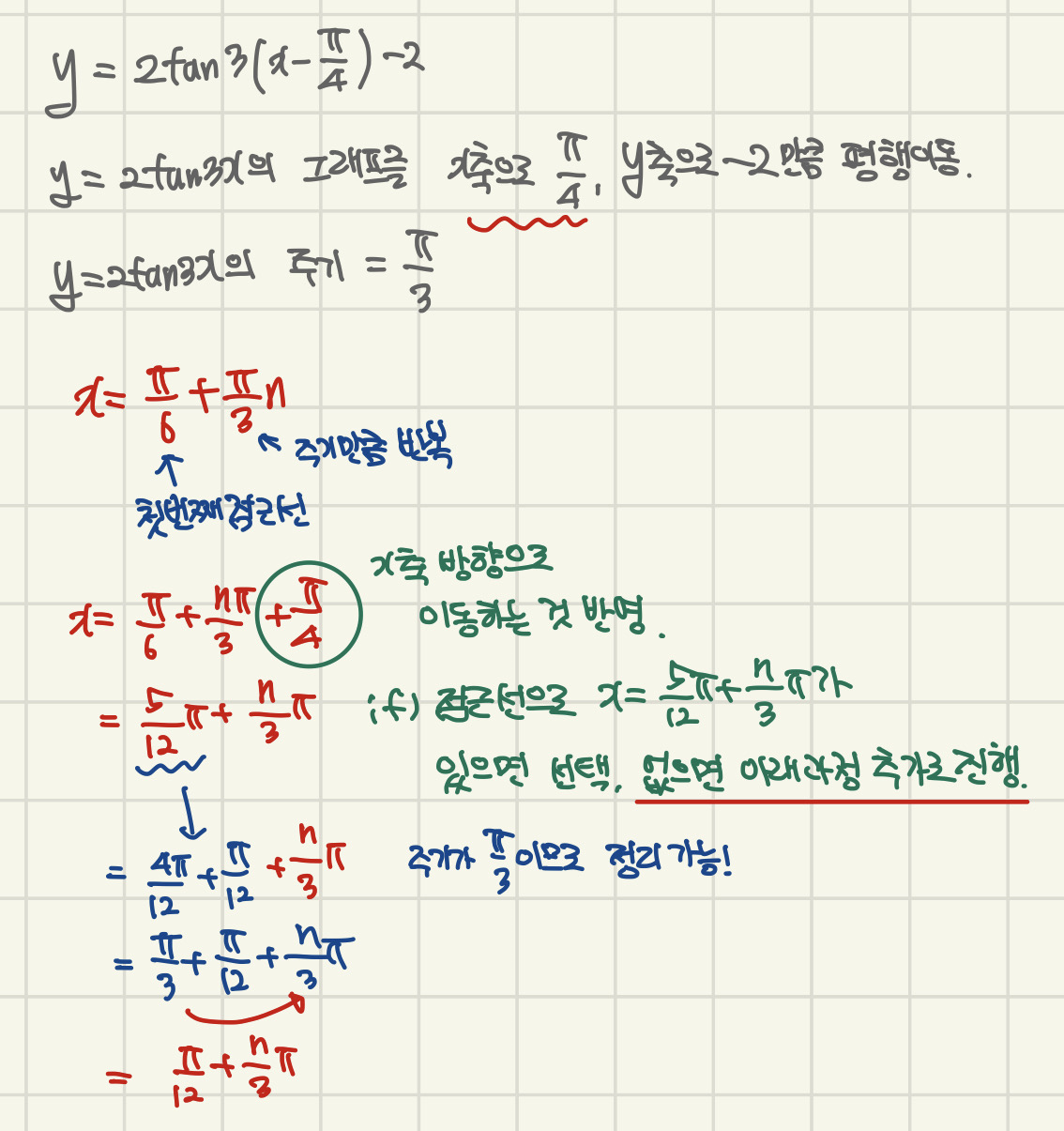 2. x=주기/2 + 주기n으로 점근선의 방정식을 세웁니다.