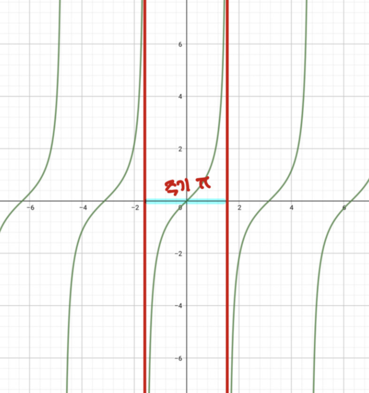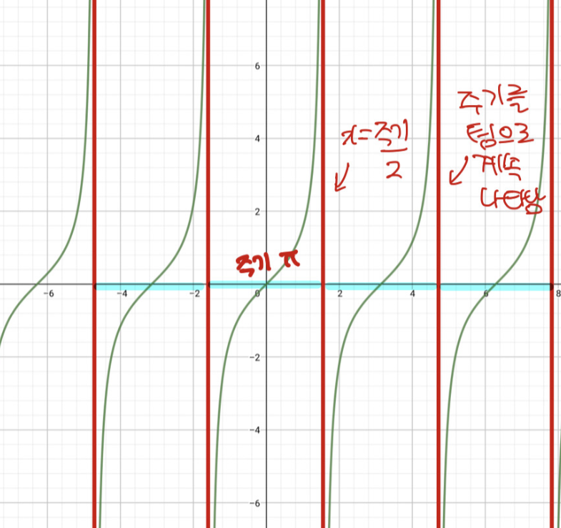탄젠트 그래프를 관찰해보니 원점을 기준으로 대칭이라, 아래와 같이 점근선의 방정식 사이의 거리가 주기인 것이 보이네요.