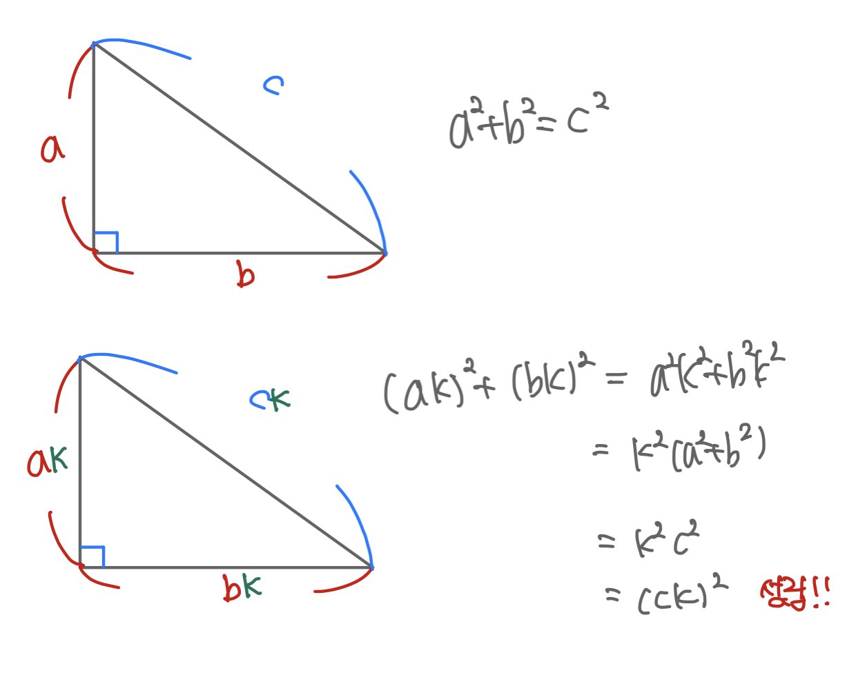 각 수에 모두 k를 곱한 수도 피타고라스의 정리를 만족합니다.