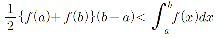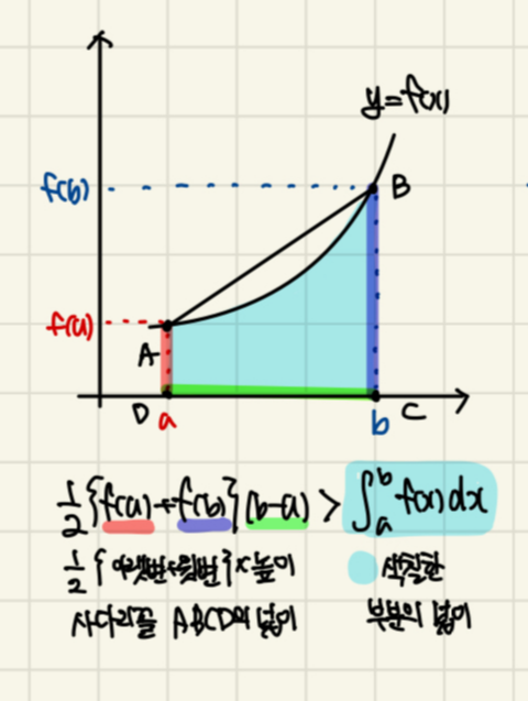 | 곡선 f(x)≥0 위의 두 점 A(a, f(a)), B(b, f(b)) (단, a<b)에 대하여 | 곡선 f(x)≥0 위의 두 점 A(a, f(a)), B(b, f(b)) (단, a<b)에 대하여 |
