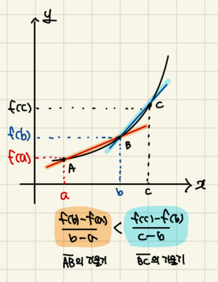곡선 y=f(x)위의 두 점 A(a, f(a)), B(b, f(b)) C(c, (c)) (단, a<b<c)에 대하여 ![]() |