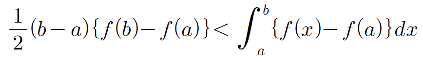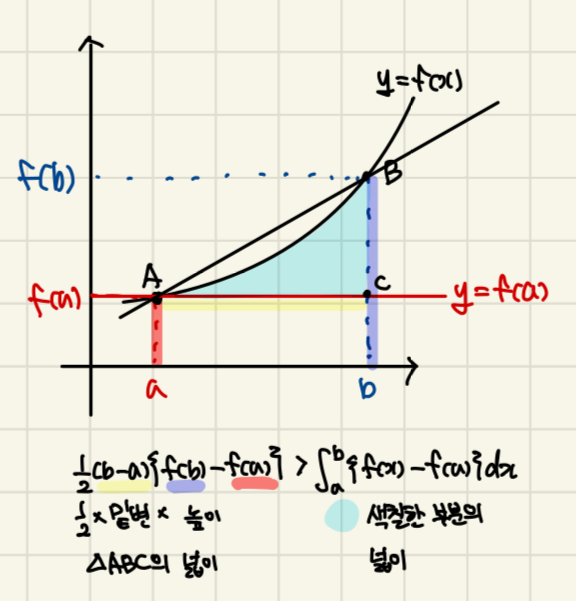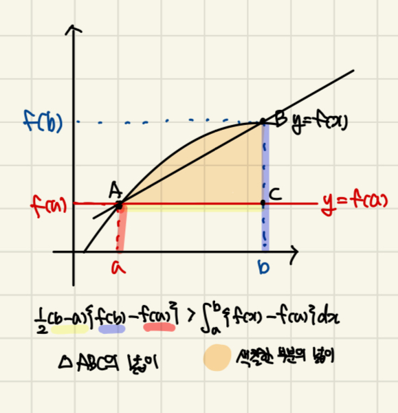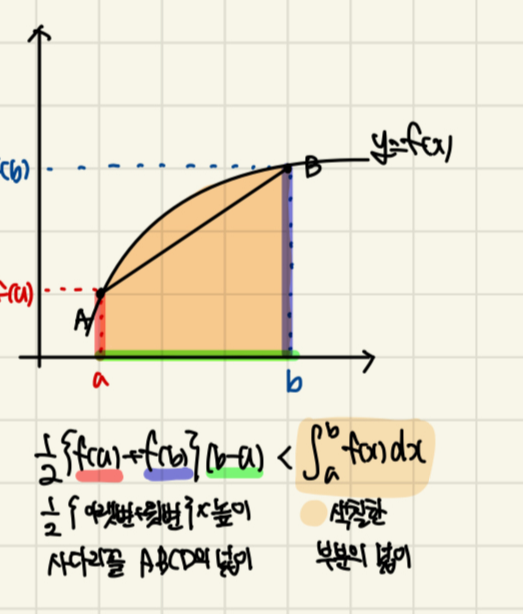 | 곡선 f(x)≥0 위의 두 점 A(a, f(a)), B(b, f(b)) (단, a<b)에 대하여 | 곡선 f(x)≥0 위의 두 점 A(a, f(a)), B(b, f(b)) (단, a<b)에 대하여 |