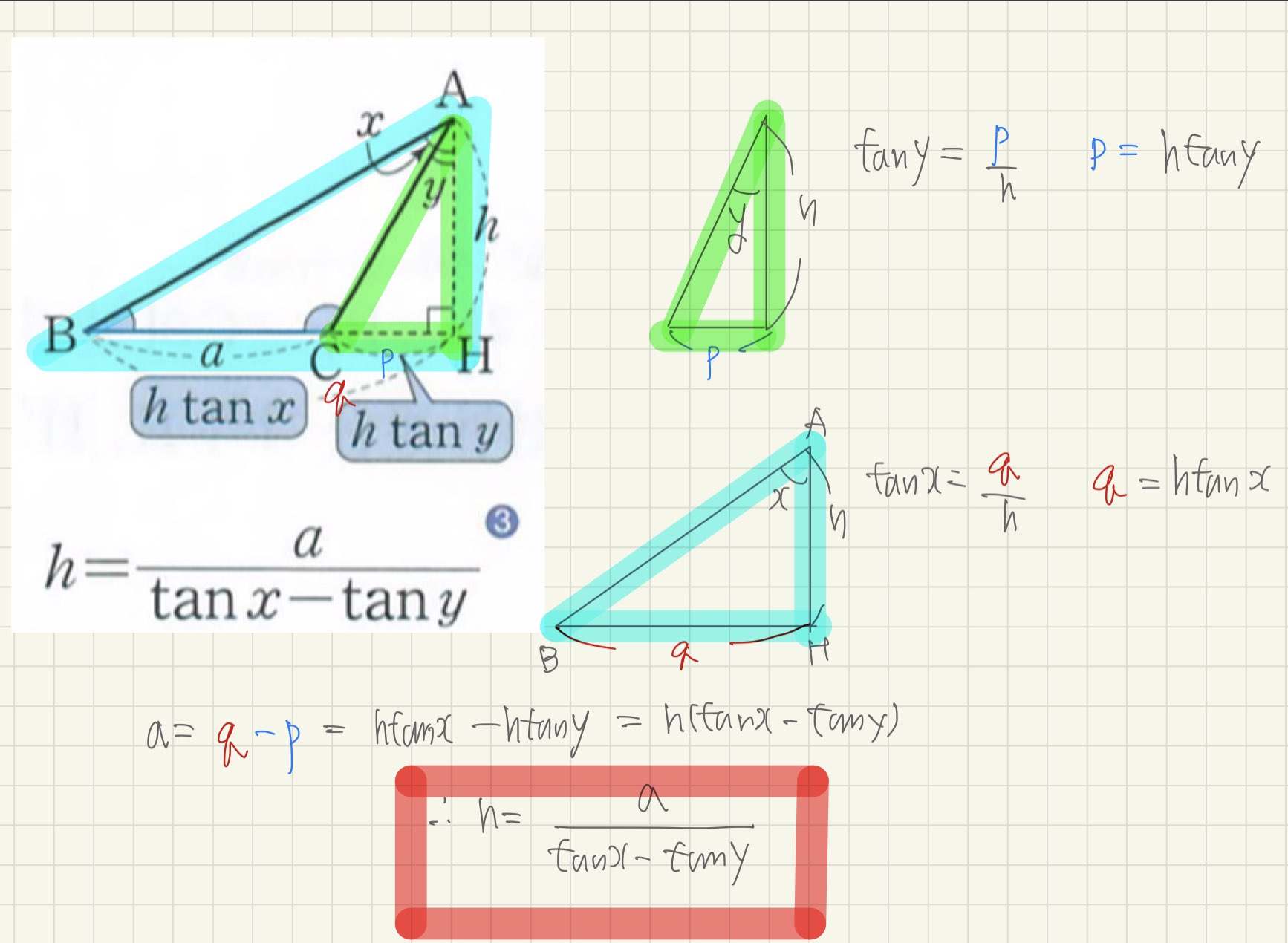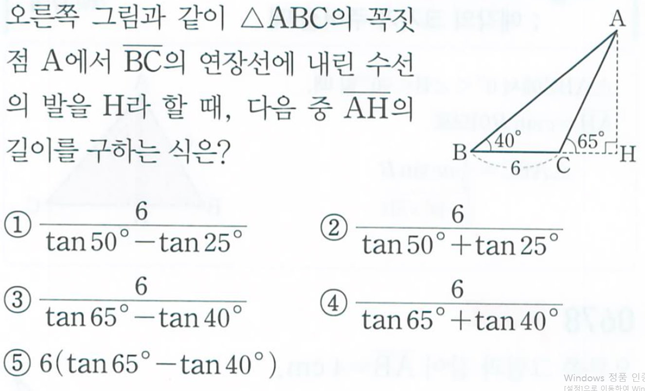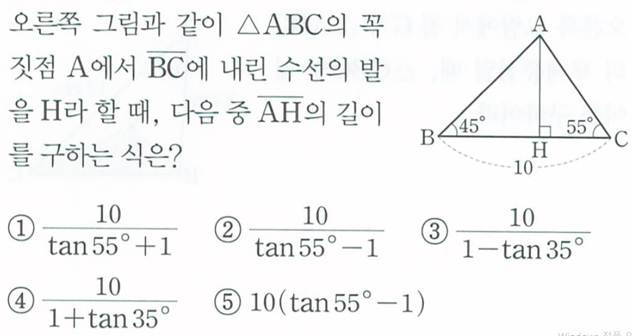 1. x라는 각은 BAH라는 큰 각입니다. 즉 전체를 봐야하는 거죠. 큰 각에서 작은값의 탄젠트를 뺀다고 외웁시다!