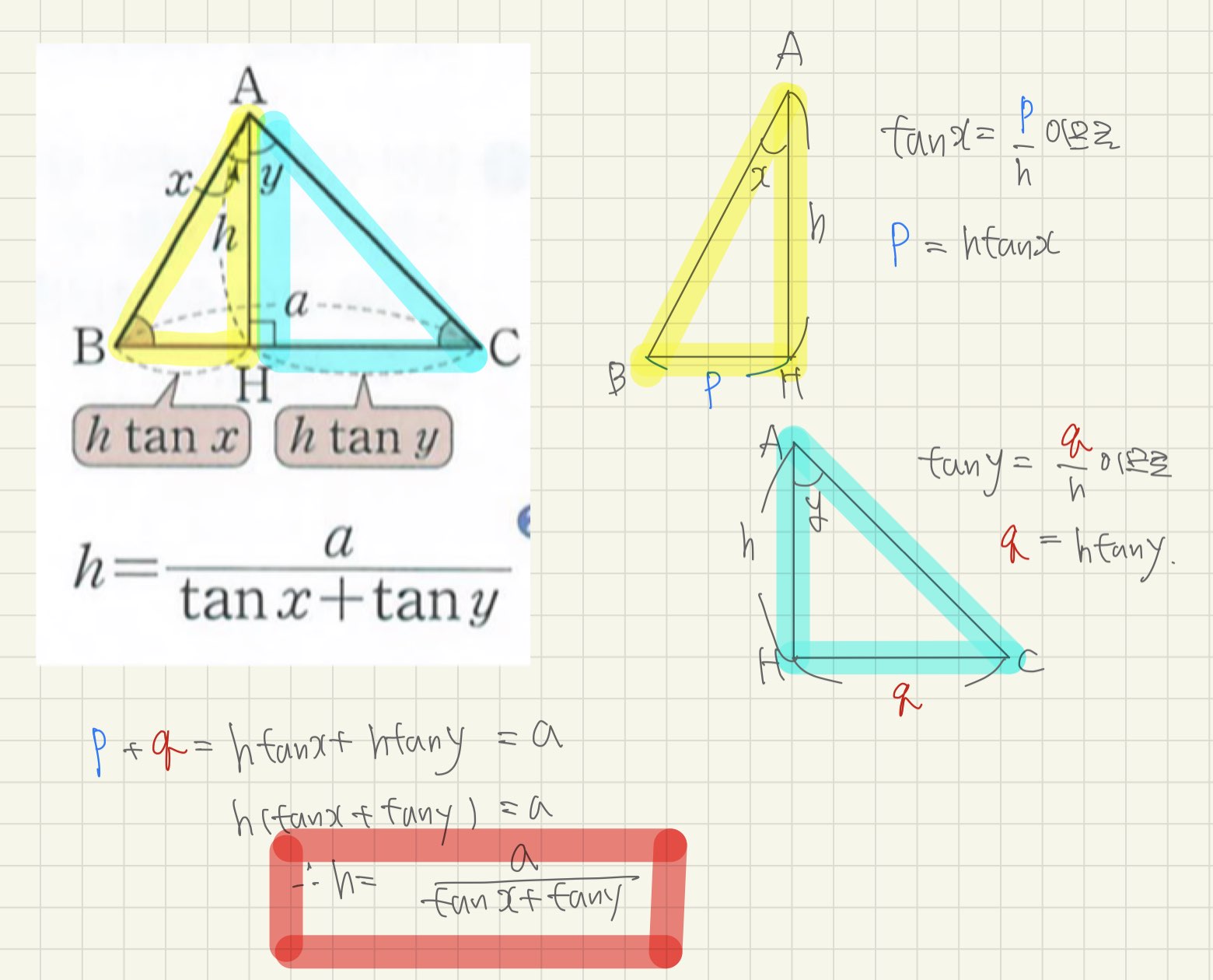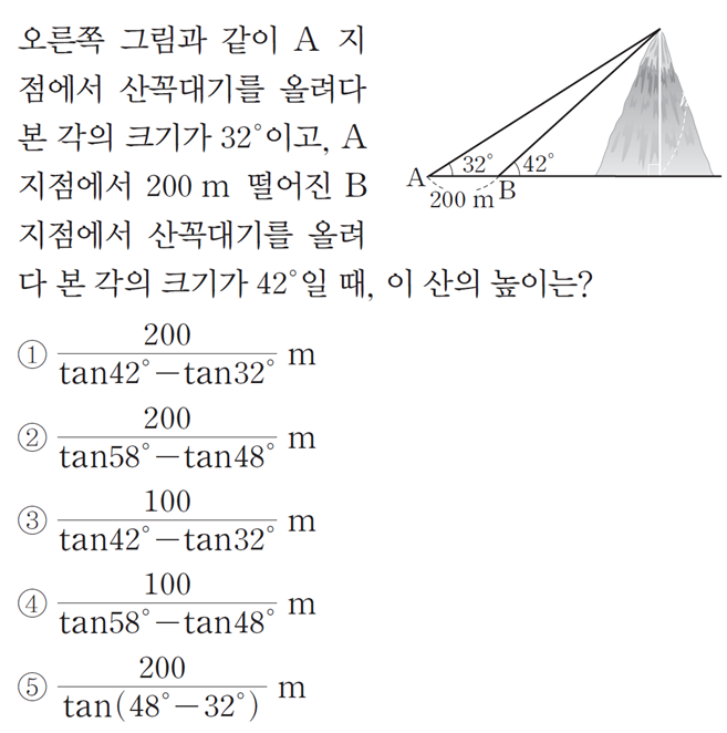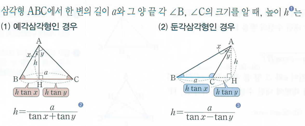 1. x라는 각은 BAH라는 큰 각입니다. 즉 전체를 봐야하는 거죠. 큰 각에서 작은값의 탄젠트를 뺀다고 외웁시다!
