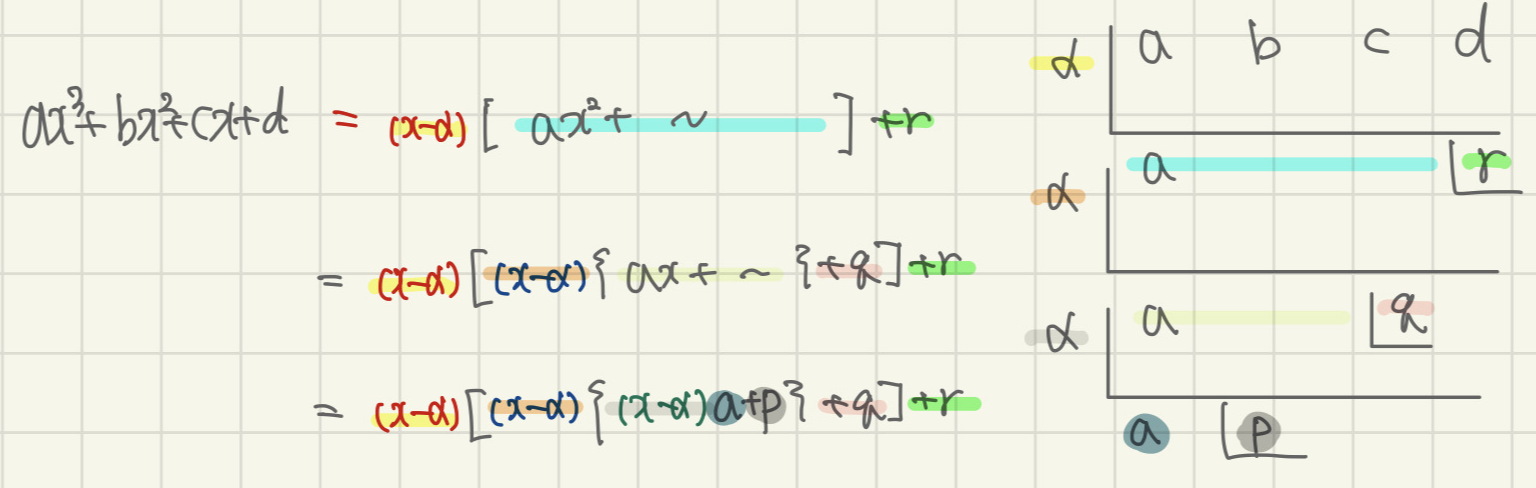우선은 주어진 삼차식을 (x-α)로 나누면 몫과 나머지가 나오겠죠? 그다음 몫으로 나온 부분만 계속 반복하여 (x-α)로 나누어줍니다. 언제까지? 3차면 3번으로 최고차 계수만 남을 때 까지요..!!