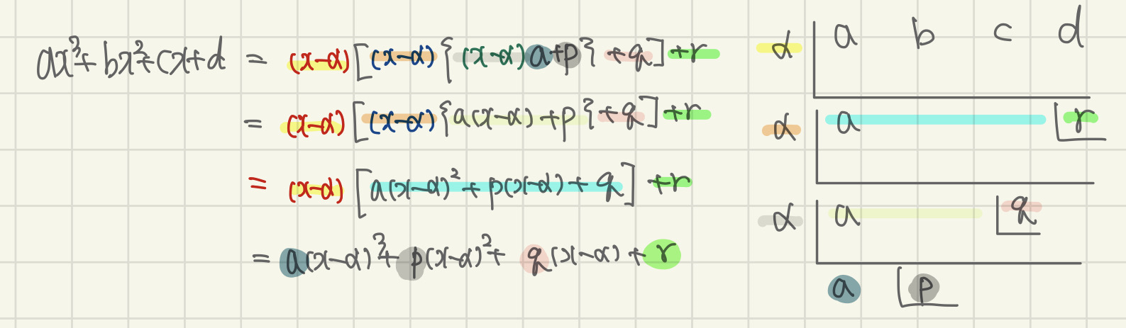 그래서 이렇게 조립제법을 여러 번 써서 나온 계수가 무슨 의미가 있는지 이 식을 다시 거꾸로 전개하면서 풀어볼게요.