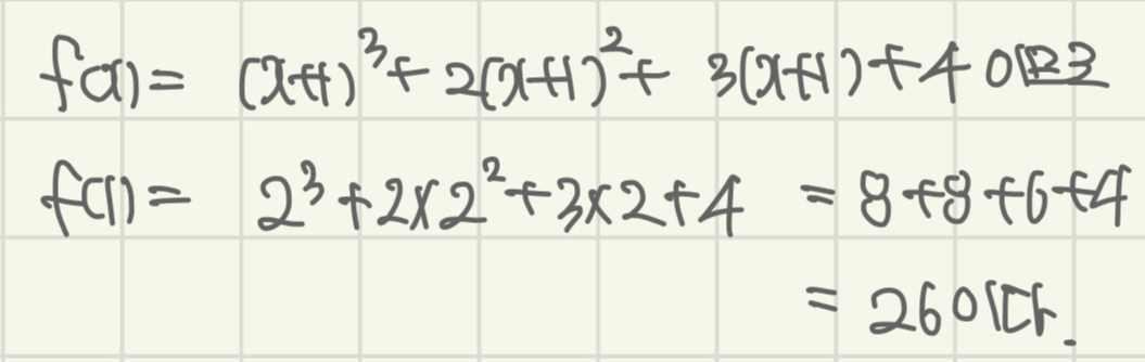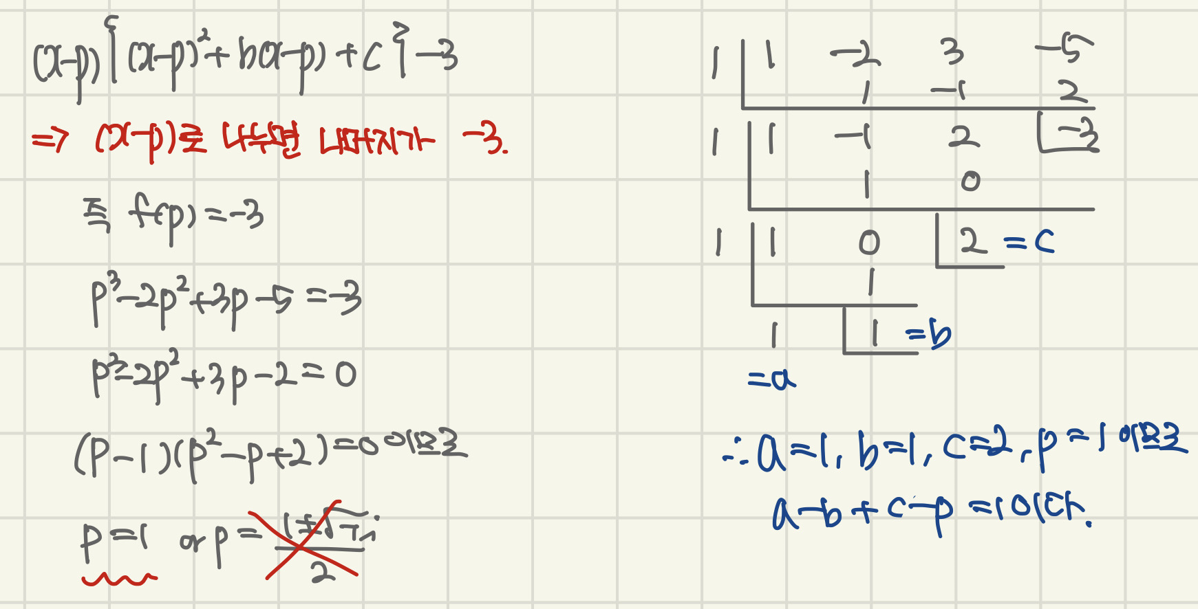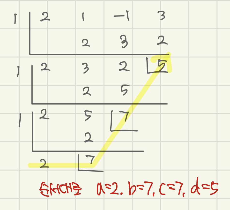 앗..! 다 풀어서 정리해보니, 조립제법에서 나머지로 나온 계수들이 차례대로 계수로 붙는다는 걸 알 수 있네요! ㅎㅎ