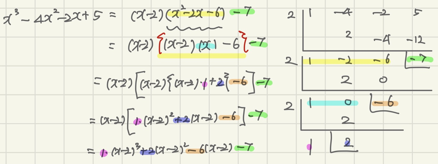 그래서 이렇게 조립제법을 여러 번 써서 나온 계수가 무슨 의미가 있는지 이 식을 다시 거꾸로 전개하면서 풀어볼게요.